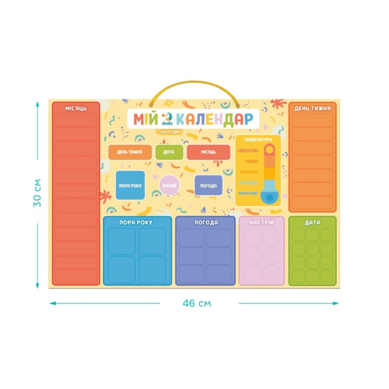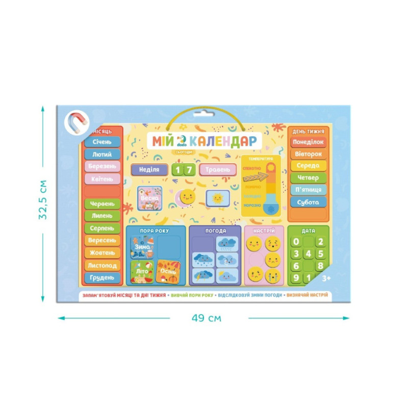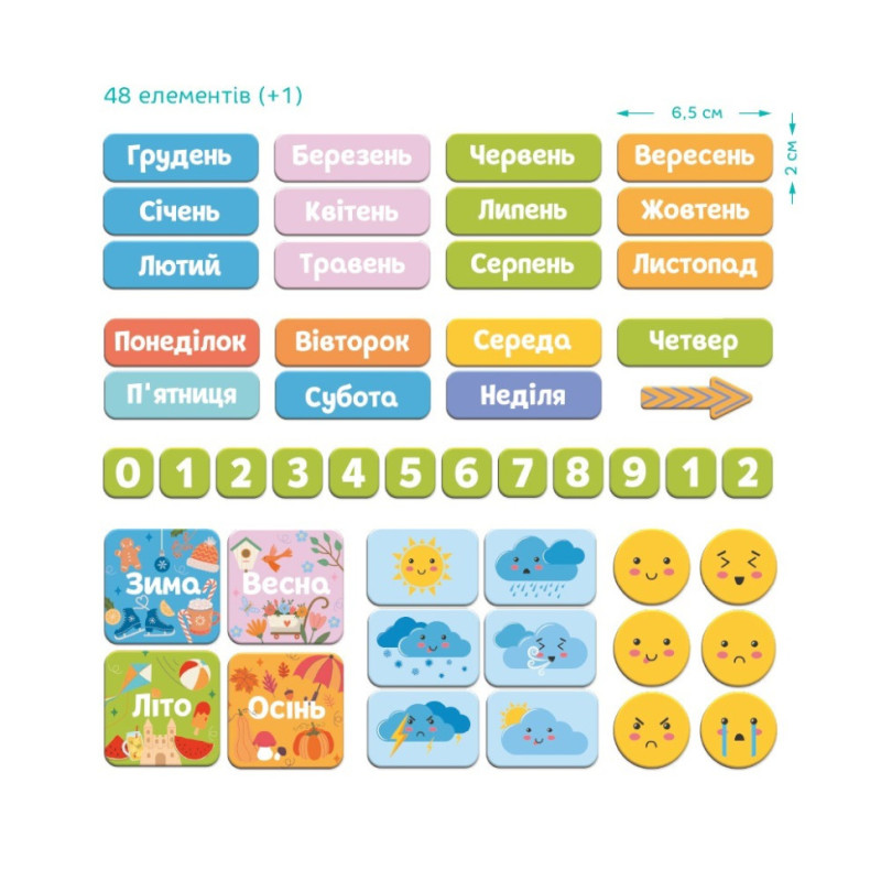 48 магнітів із назвами місяців, днів тижня, чисел, сезонів, погоди, температури та настрою;