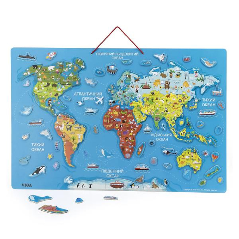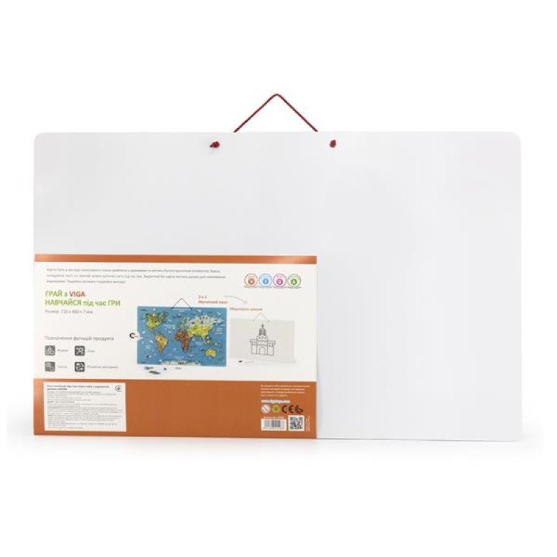 Відправляйтеся в цікаву кругосвітню подорож із магнітним пазлом Viga Toys Карта світу з маркерною дошкою українською мовою! Вивчайте назви і розташування континентів і географічних об'єктів, розміщуючи правильно на карті. А між ними помістіть літаки і пароплави, морських жителів і птахів. Мова розвивального пазла #8211; українська. Зі зворотного боку магнітної поверхні розміщена дошка для маркера з набору. Чудовий дидактичний матеріал для дошкільнят від 3 років.Складаючи дерев'яний пазл, діти в ігровій формі познайомляться з географією, підвищать рівень інтелекту, потренують координацію рук і очей, просторове мислення. Набір підходить для навчання за методикою Монтессорі, для використання в рамках інклюзивної освіти, а також рекомендований для дитячих садків і центрів розвитку.Карта світу надихне на нові ігри, добре вплине на уяву і допитливість. Діти можуть складати її разом, наочно вивчати географію, спілкуватися і весело проводити час. Магнітна дошка підходить для малювання, тренування письма і рахування.Усього в наборі 106 плоских магнітних фігурок завтовшки 0,3 см. Карту розміром 73 х 46 х 1 см можна легко повісити на стіну. Для виготовлення розвивального дерев'яного пазла використані безпечні гіпоалергенні матеріали. Як і вся продукція Viga Toys, набір відповідає міжнародним стандартам безпеки та якості дитячих іграшок: американському ASTM, європейському EN71.У комплекті дошка двостороння, 106 магнітних деталей, маркер.
