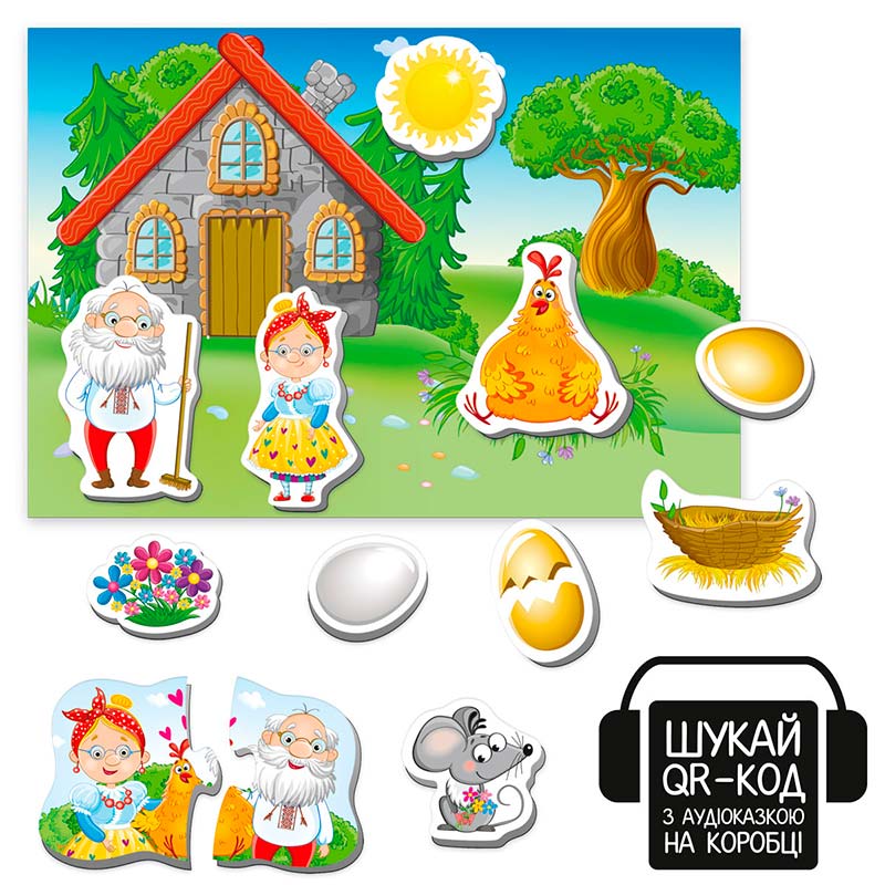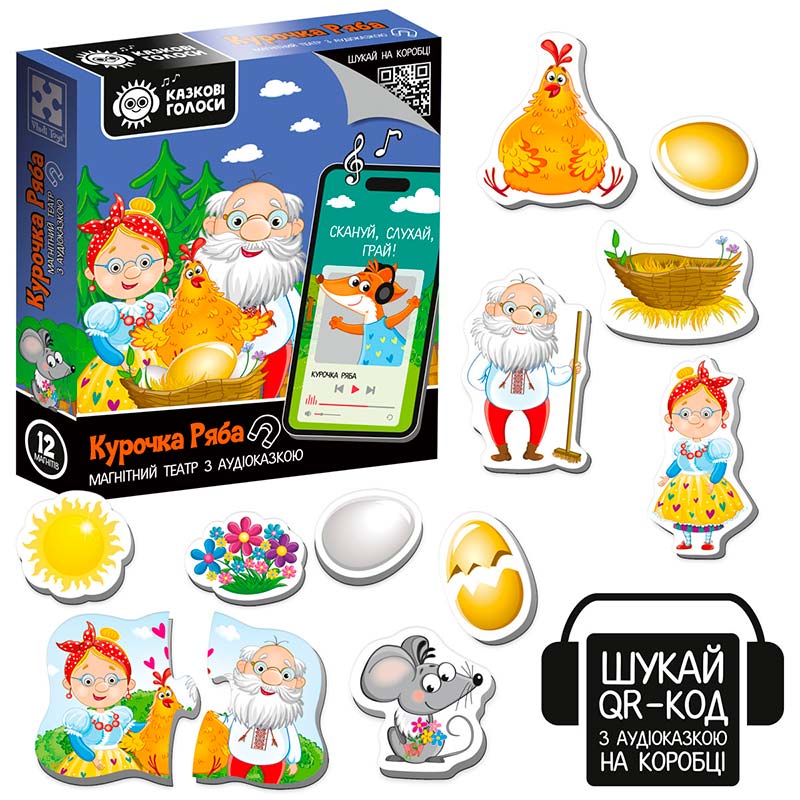 Театр і казка у коробці - комбо 2 в 1! Відкрийте коробку з магнітним театром серії “Казкові голоси”. На зворотній частині коробки відкриється QR-код. Відскануйте QR-код за допомогою гаджета і перейдіть за посиланням. За посиланням знаходиться аудіоказка “Курочка Ряба”. Включайте малюку аудіоказку, коли немає змоги почитати, слухайте також разом чи грайте з магнітами під аудіотрансляцію.