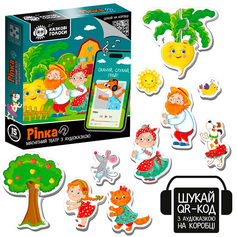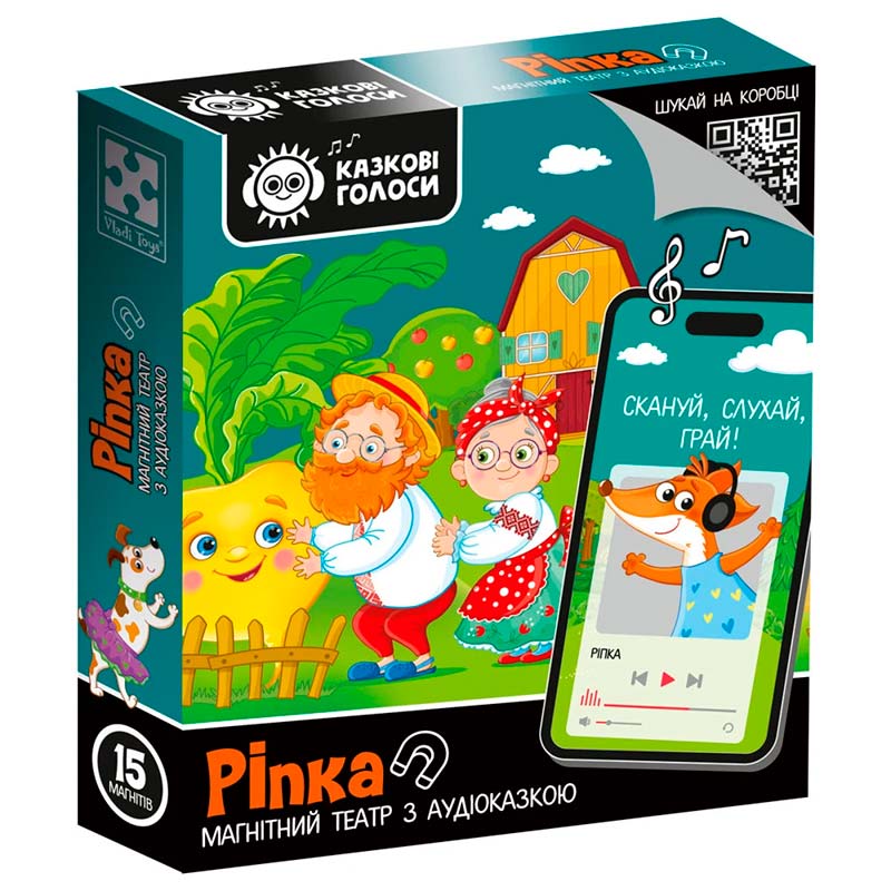 Театр і казка у коробці - комбо 2 в 1! Відкрийте коробку з магнітним театром серії “Казкові голоси”. На зворотній частині коробки відкриється QR-код. Відскануйте QR-код за допомогою гаджета і перейдіть за посиланням. За посиланням знаходиться аудіоказка “Ріпка”. Включайте малюку аудіоказку, коли немає змоги почитати, слухайте також разом чи грайте з магнітами під аудіотрансляцію.