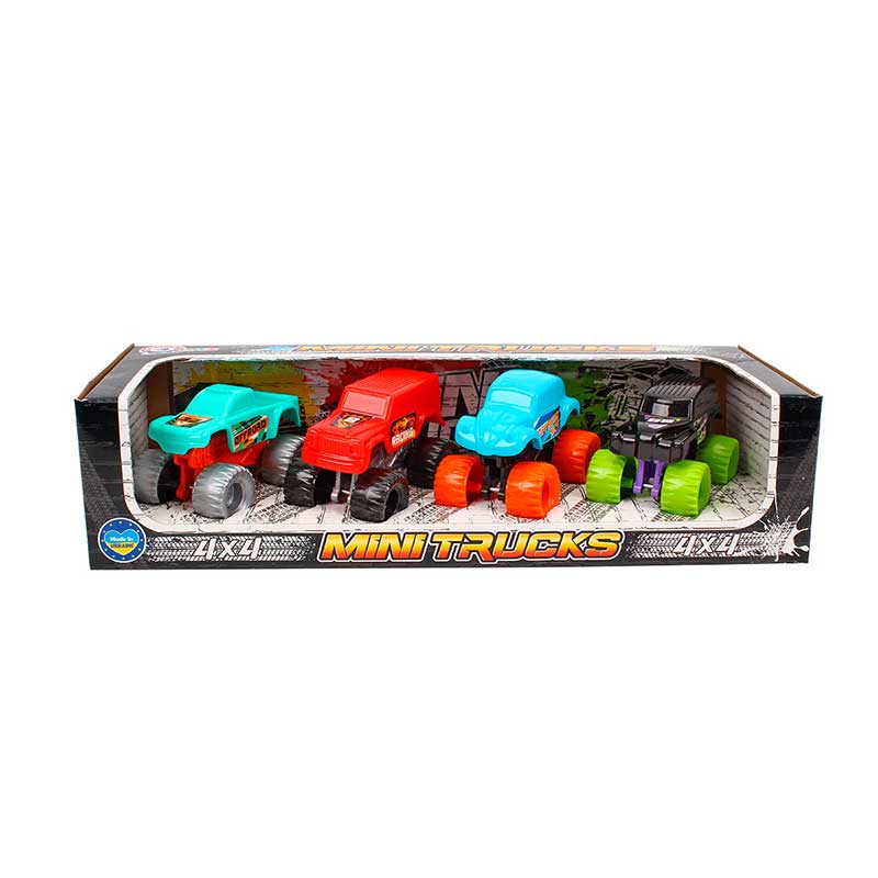 Кожен з цієї четвірки має на тільки неповторний дизайн, а й свій справжній бійцівських характер. Вони прийшли сюди з різних куточків світу, представляючи справжню колоритну розмаїтість своїх батьківщин. Головна фішка наших міні траків – вражаюче великі колеса, що забезпечують неймовірну прохідність та стійкість будь-де - від пісків пустелі до гір та, навіть, водяних перешкод. Ці машинки, хоч і маленькі у розмірі (майже в сто разів менші від справжніх, «дорослих» монстертраків), але вони мають неабиякий внутрішній потенціал та горять бажанням перемоги у поєдинку змаганні.