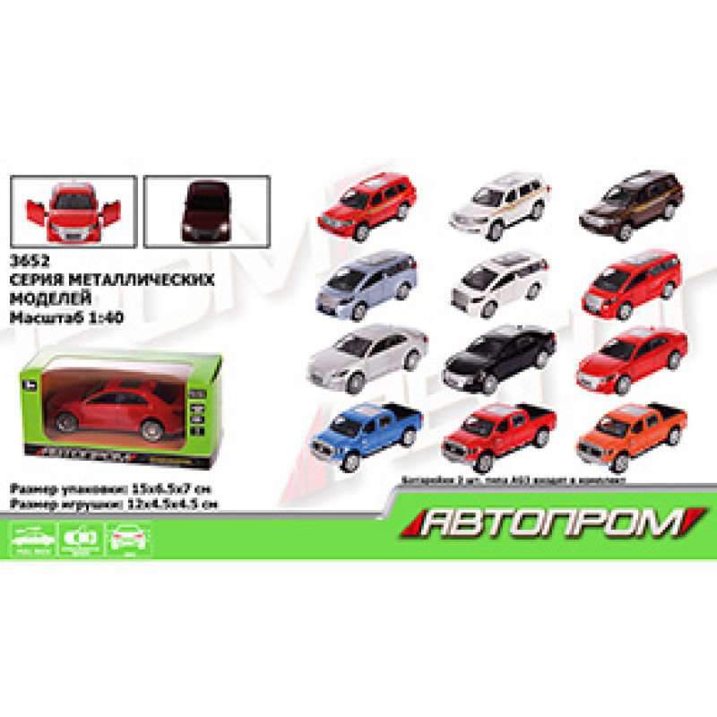 Машина метал 3652 "АВТОПРОМ", 1:32-36, 4 види по 3 кольори, батар., світло, відкр.двері, в кор. 15*6,7*7см