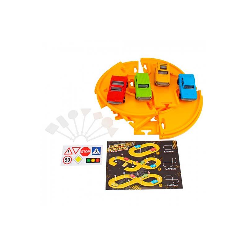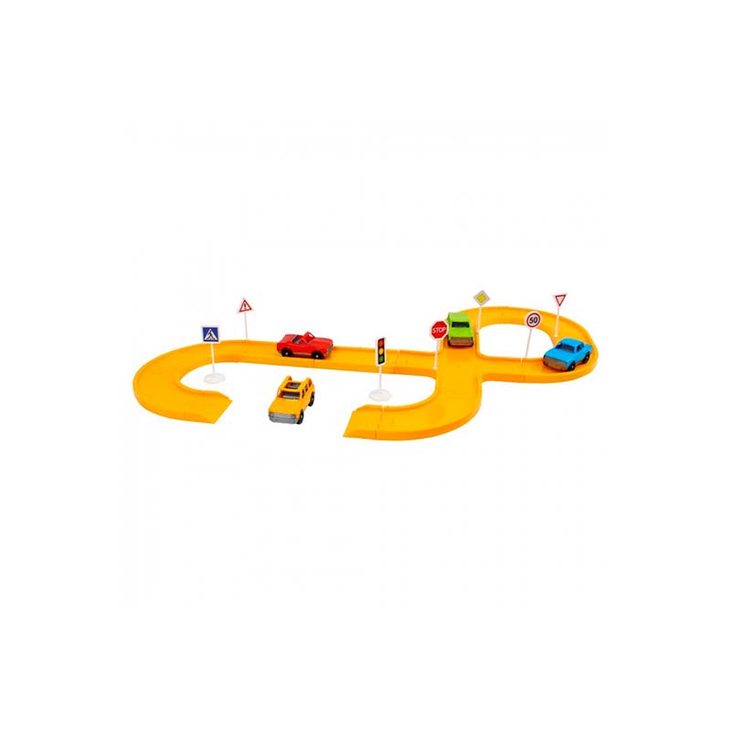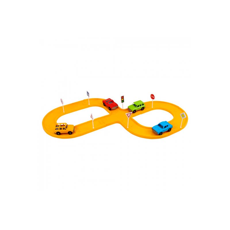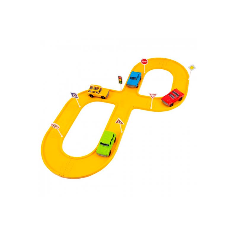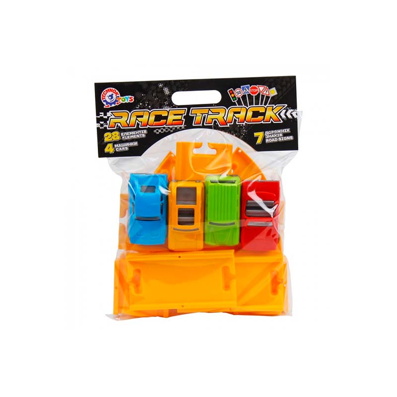 У наборі: дорожні знаки – 7 шт. і основа дорожніх знаків – 2 шт., наліпки на знаки, кольорові автомобілі – 4 шт., елементи треку – 26 шт., та кольорова інструкція.