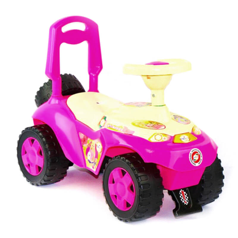 Машина виконана в яскравих кольорах, тому подобається як хлопчикам, так і дівчаткам. Кермо з клаксоном, так само за допомогою нього спрямовуються два передніх колеса. Знімну ручку-спинку дуже зручно використовувати для перенесення машинки, а малюк може завжди на неї спертися. Під сидінням передбачено місце для іграшок або всяких дрібниць.