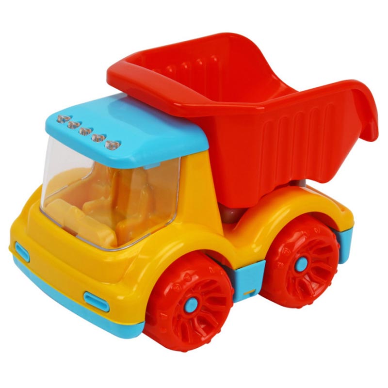 - Реалістичний дизайн: перекидний кузов, як у справжнього самоскида, та прозора кабіна з «габаритними ліхтарями» на даху повністю занурюють дитину у світ будівництва.