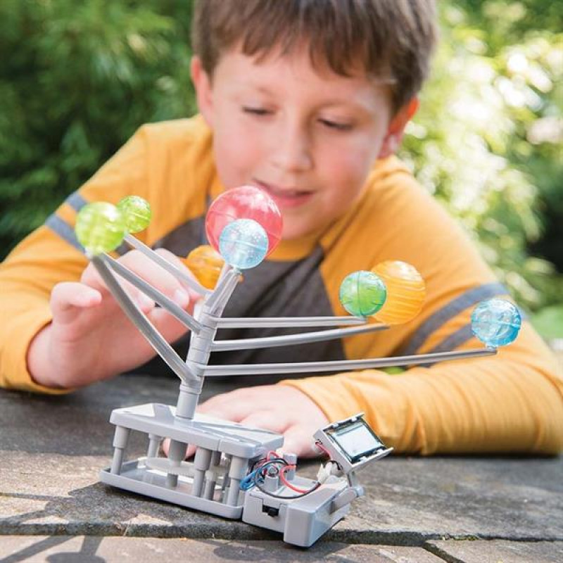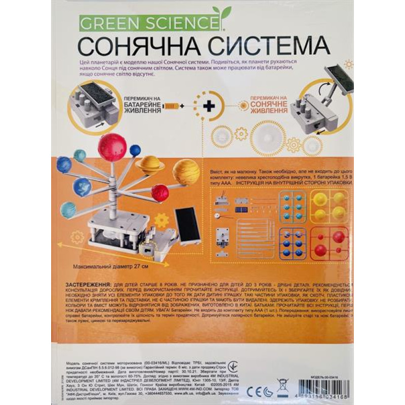 Хочете на власні очі побачити, як обертаються планети навколо Сонця? Для цього необов'язково відправлятися у космос! Кожен, хто полюбляє астрономію, відтепер може самостійно зібрати модель сонячної системи з планетами, які рухаються. До того ж, мотор працює як від батарейки AAA, так і від сонячного світла.Цей розвивальний набір із серії Green Science познайомить дітей з альтернативними джерелами енергії. Коли світло потрапляє на панель сонячної батареї, воно перетворюється на електрику, яка змушує мотор працювати. За таким же принципом влаштовані деякі дрібні прилади у вас удома, наприклад, годинники і калькулятори. Справжня побутова магія!Зберіть модель за інструкцією. Усі необхідні інструменти та деталі, крім батарейки, є в наборі. Встановіть перемикач режиму живлення в положення «сонячна батарея» та розташуйте модель сонячної системи таким чином, щоб на неї потрапляла максимальна кількість світла. Коли батарея зарядиться, ви побачите, як планети почнуть обертатися навколо Сонця. Якщо світла недостатньо, використовуйте живлення від батарейки.Набір для досліджень від 4М дарує дітям знання з астрономії, розвиває просторове мислення, навички конструювання, винахідливість. Він підходить дітям від 8 років для використання за методикою STEAM. У цьому освітньому підході діти знайомляться з різними дисциплінами: математикою, механікою, фізикою, проектуванням, мистецтвом. Методика розвиває творче мислення, навички конструювання та командної роботи.У наборі:Пластикова рамка з 6 півкулями #8211; 2 шт.Пластикова рамка з 4 півкулями #8211; 2 шт.Вісь #8211; 1 шт.Набір руків’їв #8211; 1 шт.Редуктор #8211; 1 шт.Відсік для батареї #8211; 1 шт.Панель сонячної батареї #8211; 1 шт.Кріплення для сонячної батареї #8211; 1 шт.Дріт #8211; 2 шт.Кришка для батарейного відсіку #8211; 1 шт.Опорний важіль #8211; 1 шт.Мотор #8211; 1 шт.Кришка мотору #8211; 1 шт.Клемна кришка #8211; 3 шт.Гвинт #8211; 5 шт.Інструкція #8211; 1 шт.