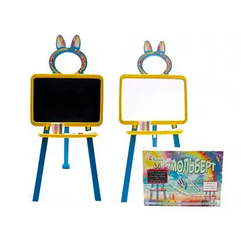 Двосторонній дитячий мольберт (малювальна дошка) є практичним інструментом для маленьких художників. Він має дві поверхні для малювання або письма: одну темну, призначену для використання крейдою, та іншу білу, придатну для водних маркерів. Мольберт легко складається і переноситься, що робить його зручним для творчості в різних місцях.