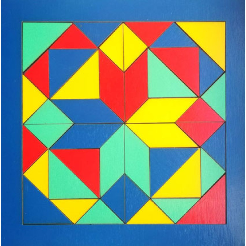 Мозаїка "Геометрика" 240*240 мм, виготовлена з фанери. Тильна сторона шліфована, без лако-фарбового покриття, лицьова сторона повністю пофарбована в 4 кольори, по 11 елементів кожного кольору, разом 44 елементи. Призначена для розвитку логіки, моторики, уваги, абстрактного мислення у дітей. Орієнтована вікова категорія від 3 до 8 років. З елементами в рамці можна не тільки вчити кольори, геометричні форми, а й складати фігури.