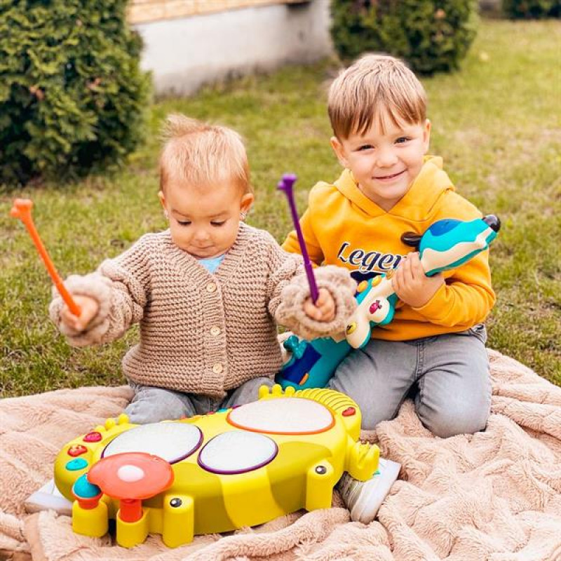 Музична іграшка Battat КВАКВАФОН S2 зі світлом та звуком - це значно веселіше, ніж цілий жаб'ячий хор!Барабанна установка, на якій можна грати без музичного супроводу або під акомпанемент в одному з чотирьох модних музичних стилів. Обирай, що більше до вподоби: рок, етно, електро-поп або урбан! Спеціальна кнопка перетворює звуки барабанів на квакання кумедного Кваквафону. В іграшці записані кілька мелодій, які також можна супроводжувати грою на барабанах. У Кваквафоні є цікава гра 'Спіймай вогник'. Є регулювання гучності, а також кнопка, що вимикає всі звуки. Музична іграшка Battat КВАКВАФОН допоможе у розвитку:музичного слуху; креативності; уяви. Розміри: 43,2 х 25,4 х 12,7 см.Живлення: 4 батарейки типу АА (у комплекті). Рекомендовано для дітей від 2 років.