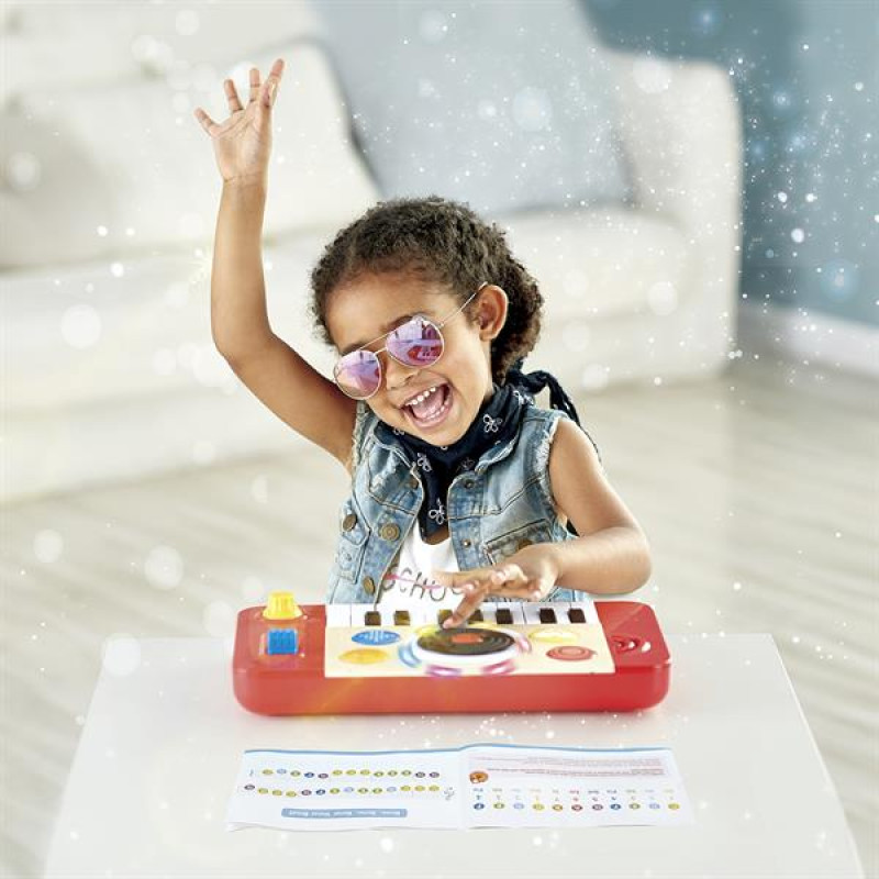 Відкрийте дитині багатий світ музики та ритмів з портативним дитячим синтезатором Hape Діджей (E0621). Музичний інструмент рекомендований для дітей від 1 до 5 років.Дитячий синтезатор Hape #8211; оригінальний музичний інструмент із безліччю цікавих функцій. На корпусі розташовані:• 18 клавіш та перемикач режимів: піаніно, барабан, орган або гітару або 18 кумедних звукових ефектів.• 4 кнопки з діджейськими звуковими ефектами;• чорна діджейська пластина для скретчу з підсвічуванням та червоною кнопкою, яка включає 5 фонових мелодій;• повзунок темпу;• регулятор звуку (2 режими).В комплект входить брошура з нотами та наклейки на клавіші.Пульт діджея Hape покращує зорово-моторну координацію, тренує музикальних здібності, почуття ритму та слух, допомагає дитині розвиватися творчо.Іграшка виготовлена із міцних та безпечних матеріалів. Набір відповідає міжнародним стандартам якості EN 71 та ASTM F963.Дитячий синтезатор Hape відзначений нагородами Junior Design Awards 2021, Tillywig Awards, Pal Awards.Для роботи іграшки потрібні 3 батареї АА (не входять до комплекту).