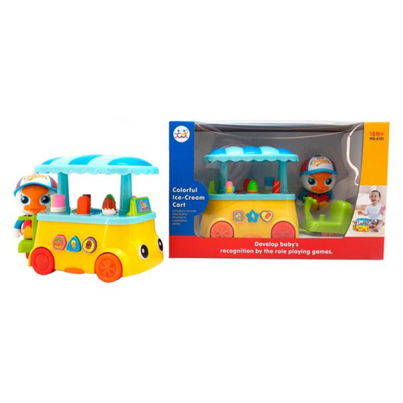 Симпатичне каченя керує фургончиком з морозивом. Барвистий візок блимає вогниками, іграшкове морозиво можна дістати. Візок має кнопки включення, виключення і регулювання гучності. Натискаючи на кнопки, малюк також познайомиться з різними формами. Причіп із каченям можна від'єднати від візка, і грати з каченям окремо.Розвивальна музична іграшка призначена для дітей від 18 місяців. Є мелодії, звукові ефекти. Іграшка сприяє вивчення форм, кольорів, англійської мови. Працює від 2 батарей типу AА (не в комплекті).