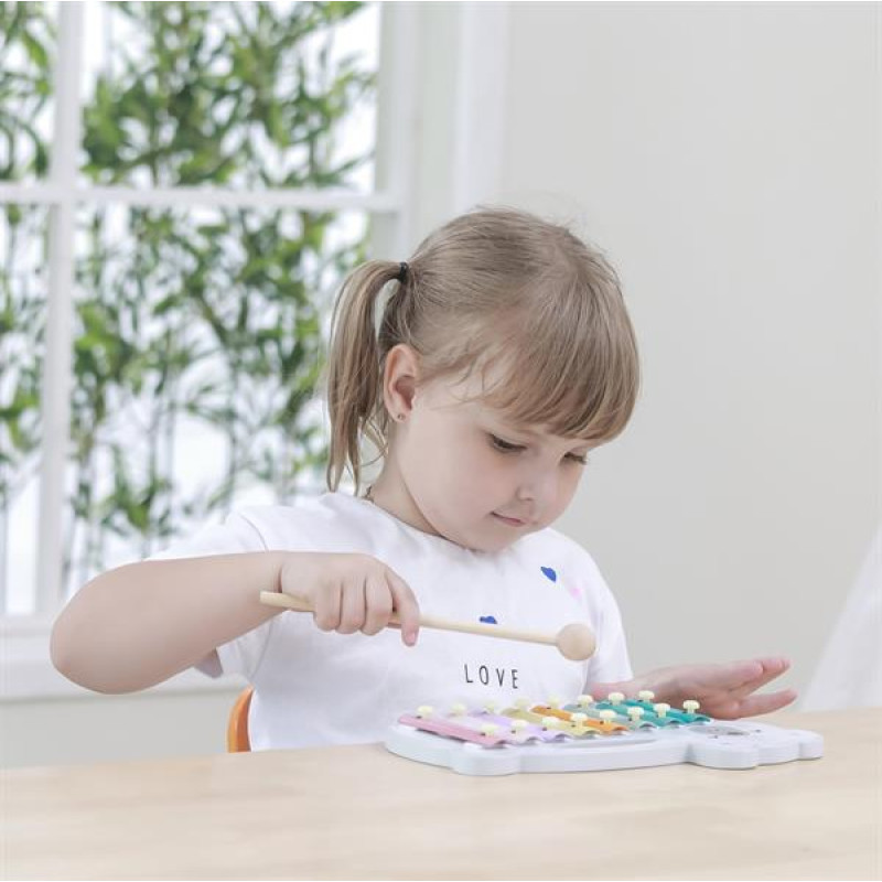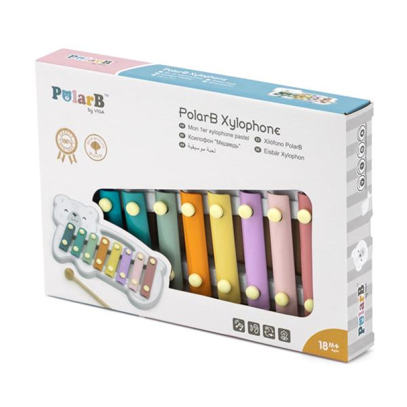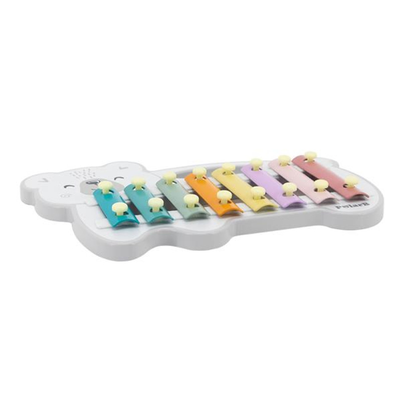 Познайомте дитину з музичною іграшкою PolarB Ксилофон-ведмедик. У комплекті дерев'яний молоточок і панель у формі північного ведмедика з 8 металевими пластинами різної тональності. У верхній частині ксилофона є зручна ручка для перенесення. Розвивальна іграшка зацікавить дітей переддошкільного віку від 18 місяців.Гра на ксилофоні поліпшить координацію руки-очі, слухові навички, мислення, познайомить із музикою, покращить настрій малюка веселими звуками. Різні кольори металевих пластин тренують колірне сприйняття. Музична дерев'яна іграшка підходить для інклюзивної освіти.Невеликий розмір ксилофона 25,5 х 17,5 х 13 см робить його зручним для дитячих ручок. Дитина зможе переносити іграшковий музичний інструмент, бити молоточком по клавішах, розвиваючи велику моторику рук. Різні звуки і вміння вистукувати ритм тренують слух, що позитивно впливає на пам'ять, інтелект. Дитячий ксилофон допомагає проявити творчі здібності при створенні власних мелодій.Для виготовлення розвивальної дерев'яної іграшки PolarB використані безпечні матеріали, пастельні гіпоалергенні фарби. Усі краї та кути згладжені та ретельно відшліфовані. Ксилофон відповідає європейському EN71 і американському ASTM сертифікатам якості, як і вся продукція PolarB.У комплекті ксилофон із ручкою і дерев'яний молоточок.