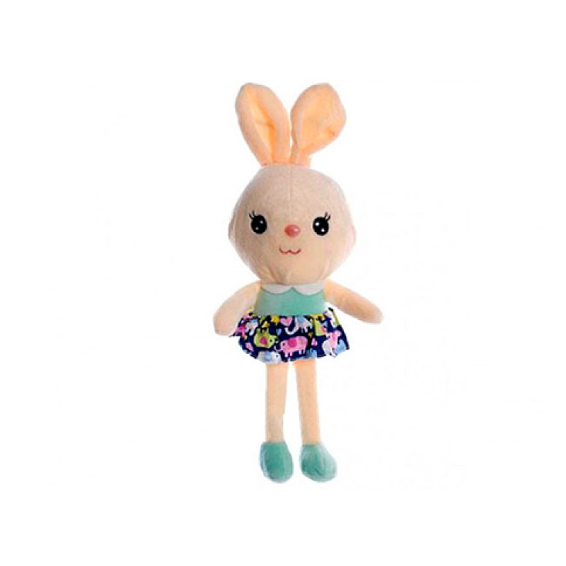 М'яка зайка тілесного кольору в чудовій блузочці кольору морської хвилі з білим комірцем, в спідничці зі слониками і взутті блакитного кольору - захопить Вашу дитину в світ фантазій, допоможе малюкові розвинути моторику і уяву.