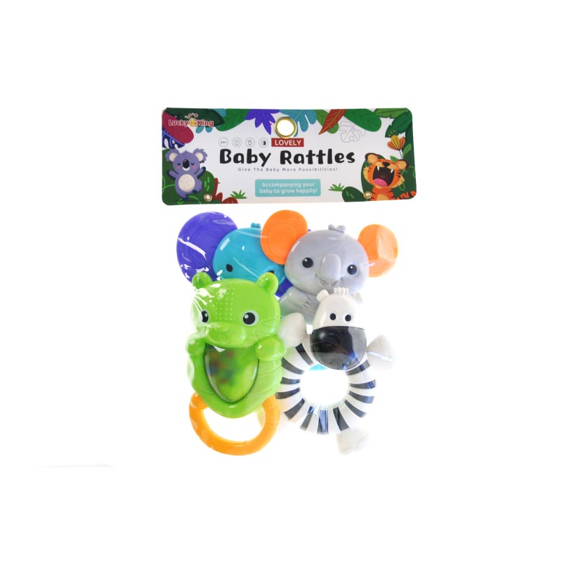 Яскравий комплект з чотирьох брязкалець для перших ігор малюка, що поєднує різноманітні форми, текстури та звукові ефекти. Кожна іграшка створена, щоб приваблювати увагу, пробуджувати цікавість і підтримувати перші кроки у розвитку сенсорики.