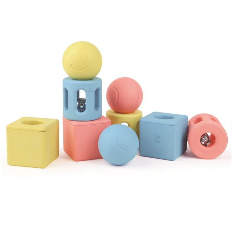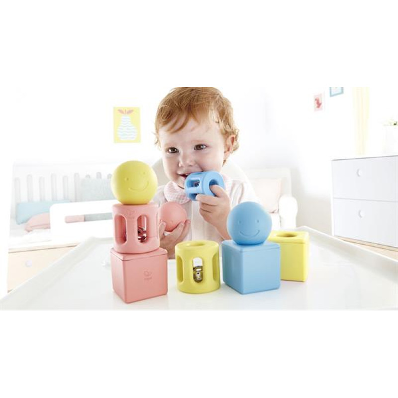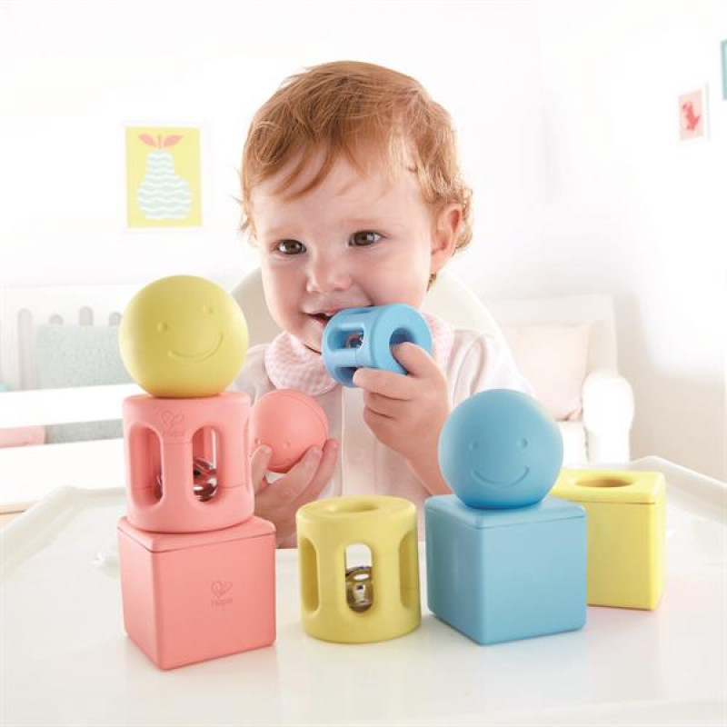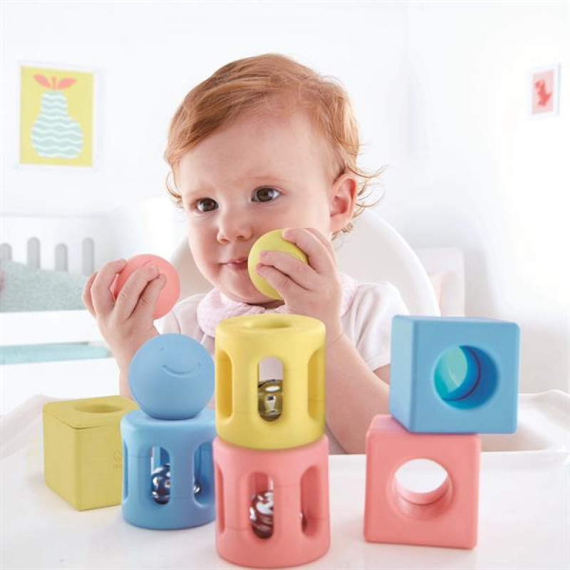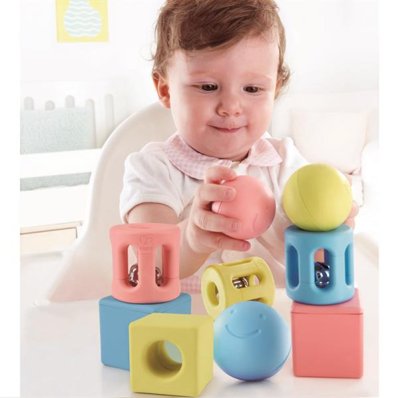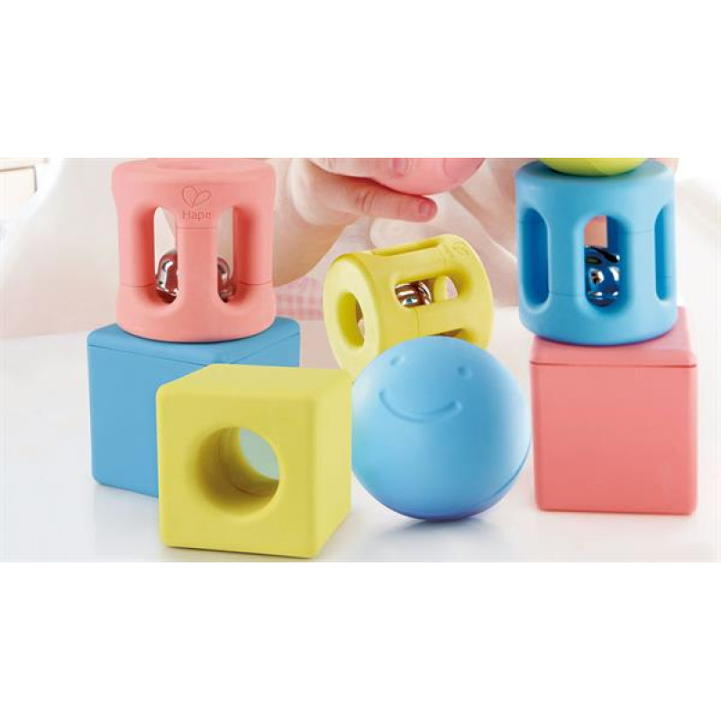 Набір брязкалець Hape Геометричні фігури 9 в 1 для малюків від народження. Чим зацікавити дитину першого року життя? Звичайно, брязкальцями. Головне, щоб вони були екологічними. Брязкальця виготовлені з матеріалу на основі рису і є безпечними для малюків. Фігури-брязкальця можна використовувати окремо або разом, споруджуючи з них пірамідки. Набір складається з 3 куль, 3 циліндрів і 3 кубів. У кожному з квадратів є кольорова лінза, яка потішить дитину.Набір брязкалець Hape Геометричні фігури 9 в 1 (E0456) відповідає міжнародним стандартам якості EN 71 і ASTM F963.
