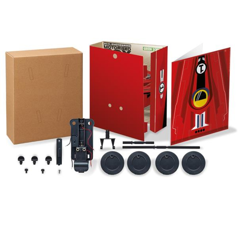 Науковий набір 4М Машина з коробок дозволяє перетворити порожні коробки в рухому конструкцію. Машина з коробок може їздити, завдяки двигуну та силі тертя. Набір створений для дітей від 5 років дошкільного віку.Зберіть робота за інструкцією з малюнками. У ній також є пояснення принципу роботи, цікаві факти. Включайте гоночну чудо-машину і спостерігайте, як творіння ваших рук «оживає»!Набори серії Green Science долучають дітей до наукових досліджень, вчать збирати пристрої за інструкцією. У процесі складання розвиваються допитливість, мислення, уважність, уява, навички конструювання, винахідливості. Такі заняття формують націленість на результат, знайомлять із фізикою, механікою, робототехнікою в ігровому форматі. Створення машини з коробок відволікає від інтернету і мотивує цікавитися наукою. Набір підходить для занять удома, на розвивальних курсах за освітньою методикою STEAM.Чому машина рухається? Коли ви включаєте її, то замикаєте ланцюг, що з'єднує батарею з електродвигуном усередині корпусу коробки передач. Електрична енергія тече від батареї до двигуна, що перетворює цю енергію в механічне обертання. Вісь двигуна обертається з високою швидкістю, але невеликою потужністю, і сама по собі не зможе переміщати машину. Двигун обертає кілька шестерень усередині корпусу редуктора, які знижують швидкість і збільшують механічну потужність двигуна, роблячи його більш ефективним. Більшість машин, зокрема справжні автомобілі, використовують коробку передач для зміни потужності й швидкості подібним чином.Тягова вісь машини обертає два великих колеса, які переміщують машину вперед при обертанні. Колеса повинні зчіплюватися з поверхнею, по якій рухається автомобіль, якщо машина їде вперед. Колеса залежать від сили тертя з поверхнею. Тертя #8211; це сила, що виникає між будь-якими двома об'єктами, що торкаються один одного. Справжні автомобілі збільшують тертя з дорожнім покриттям за рахунок використання гумових шин, які поліпшують зчеплення з дорогою.Тертя #8211; дуже важлива сила, яка багато в чому впливає на наше життя. Іноді нам потрібно зменшити тертя, тому ми змащуємо деталі машин. У ковзанярів є тонке металеве лезо на взутті, щоб ковзати по гладкому льоду. В інших випадках ми хочемо збільшити тертя, тому гоночні автомобілі мають широкі колеса, а підошви кросівок зроблені з гуми і мають протектори для додаткового зчеплення.У наборі є всі необхідні деталі для збирання машини. Корпус складається зі звороту упаковки. Додатково потрібні: 1 батарейка ААА і хрестова викрутка.