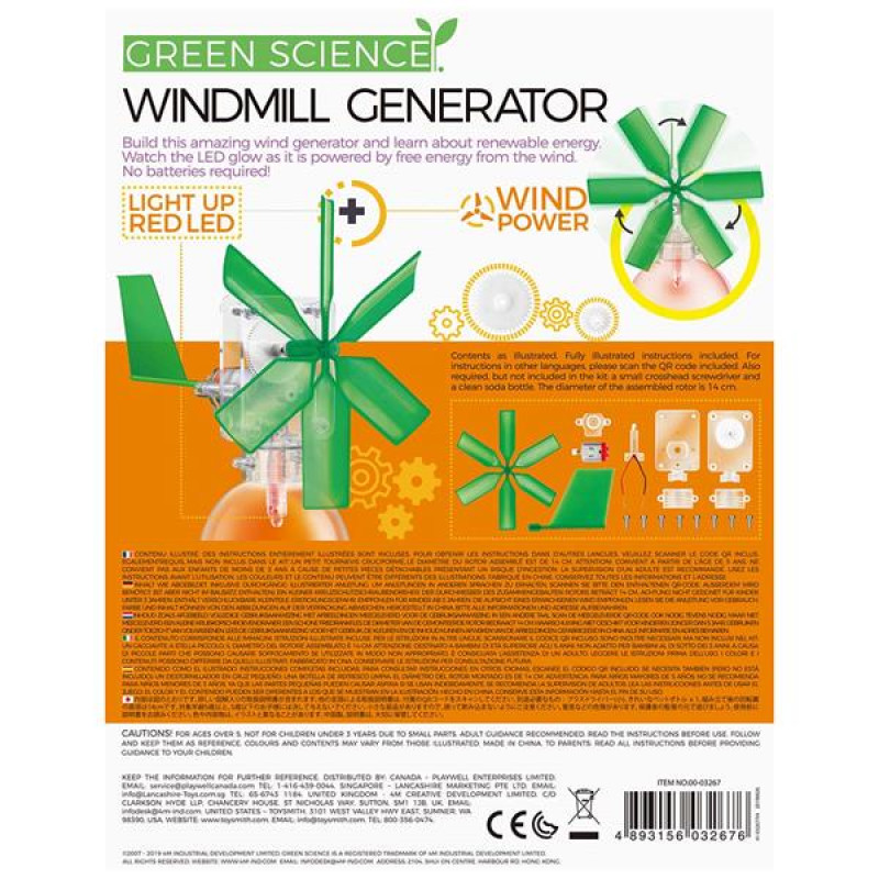 Зберіть із набором для досліджень 4M вітрогенератор, який вловлює енергію вітру і перетворює її на світло. Познайомтеся ближче з поновлюваними джерелами енергії, важливими для збереження екології планети Земля. Набір підійде дітям від 8 років молодшої школи.У наборі ви знайдете докладну інструкцію з малюнками і необхідні деталі для складання вітрогенератора.Як випробувати готову модель? Для запуску на вулиці, тримайте пластикову пляшку вертикально однією рукою і направте ротор у бік вітру. Наполовину заповніть пляшку водою, щоб зробити її стійкішою, і поставте генератор на землю. Вітрогенератор перетворює енергію вітру на світло, тому світлодіод горить. Вітер тисне на лопаті ротора, примушуючи його обертатися завжди в одному напрямку. Чим сильніший вітер, тим швидше обертається ротор. Спробуйте винести модель вітрогенератора на вулицю ввечері та подивіться, як спалахує світлодіод, коли дме вітер. Для запуску моделі в приміщенні, можна використовувати побутовий електровентилятор із живленням від мережі, щоб імітувати вітер.Що дає дітям набір для наукових досліджень? У процесі складання моделі вітрогенератора діти отримують навички конструювання, розвивають мислення, винахідливість, інтелект, розширюють свій кругозір, стають більш уважними, цілеспрямованими, допитливими, вчаться терпляче йти до результату. І все це без інтернету і гаджетів, що безсумнівно сподобається батькам і вихователям. Набори для досліджень Green Science долучають дітей до світу науки через складання і запуск цікавих моделей. Комплект добре підходить для занять удома, у молодшій школі, на освітніх курсах STEAM.На чому заснована робота моделі? Коли ротор буде обертатися достатньо швидко, загориться світлодіодна лампочка, показуючи, що вітрогенератор виробляє електрику. Його принцип роботи простий: він перетворює енергію вітру на світло. Вітер переміщує повітряні маси лінійно, а все, що рухається, має енергію. Лопаті генератора вловлюють цю енергію і перетворюють її в обертання. Генератор трансформує кінетичну енергію лопатей в електричний струм, який живить світлодіод.Енергія вітру #8211; поновлюване джерело енергії. Її здавна використовували для перемелювання зерна на борошно. Для цього будували вітряні млини. У наші дні енергію вітру використовують для виробництва електроенергії. Найбільша вітряна електростанція у світі розташована в Техасі, США. Усього в ній 421 вітряний генератор. Вона виробляє 735 мегават енергії, якої вистачить, щоб закип'ятити півмільйона чайників одночасно.Набір отримав 8 нагород на міжнародних спеціалізованих виставках в Італії, Гонконгу, Бразилії, США з 2008 по 2016 роки.У наборі: ротор, вал ротора, передня і задня частини корпусу, 2 половинки кришки з різьбою для пляшки, хвостова частина, вал ротора, мотор із шестернею, кришка мотора, 8 маленьких гвинтів, світлодіод із проводами, 1 шестерня з металевою віссю. Додатково потрібні (немає в комплекті): пластикова пляшка, невелика хрестоподібна викрутка. Батарейки не потрібні.