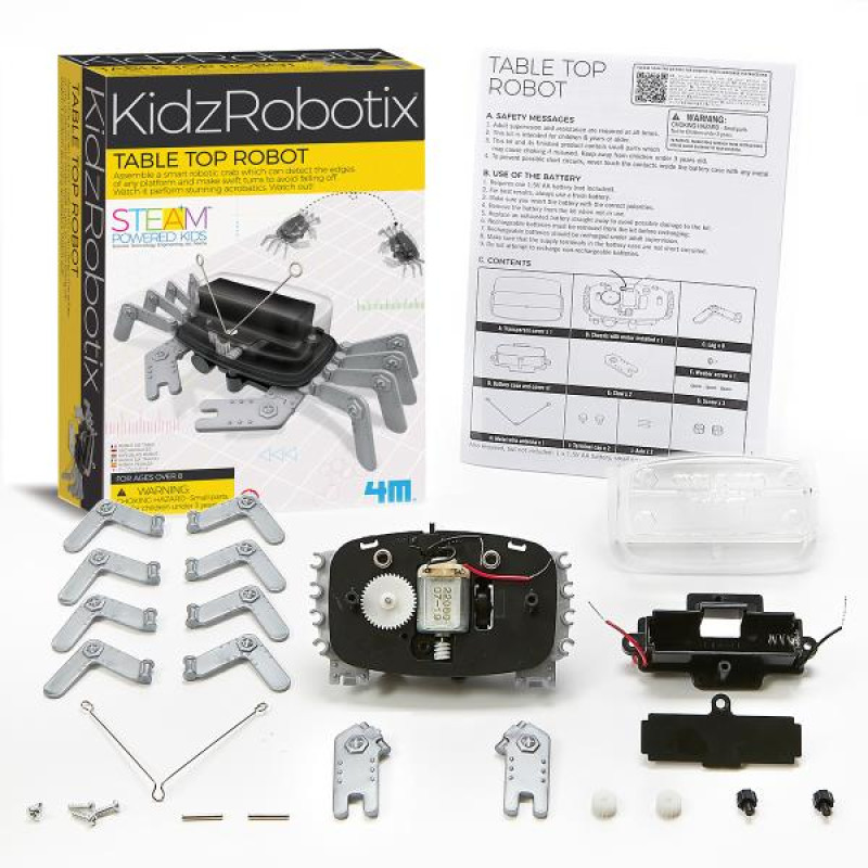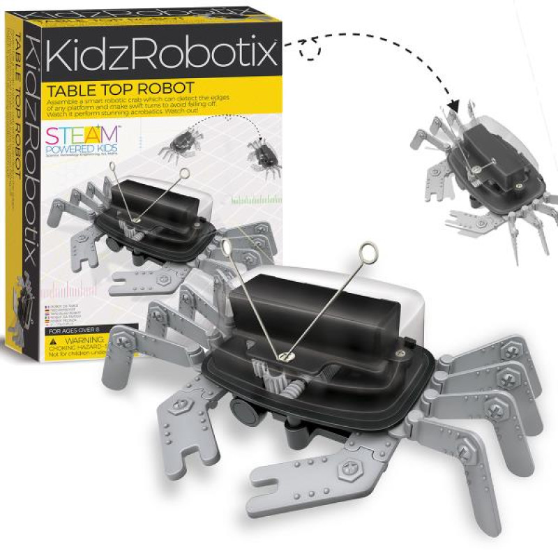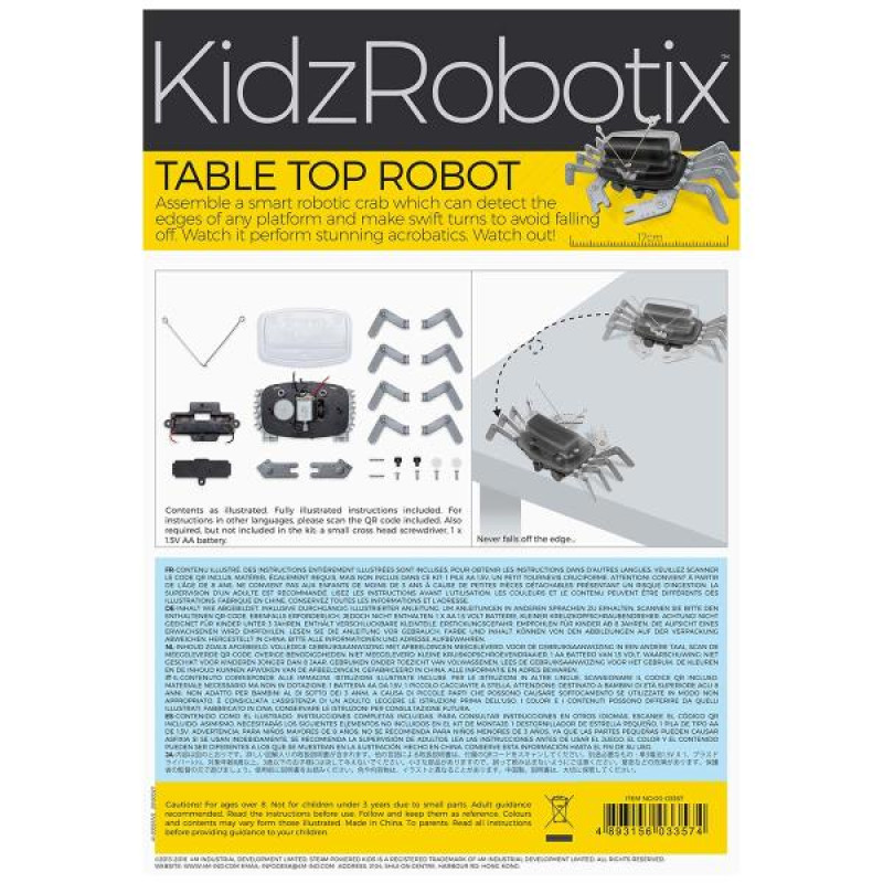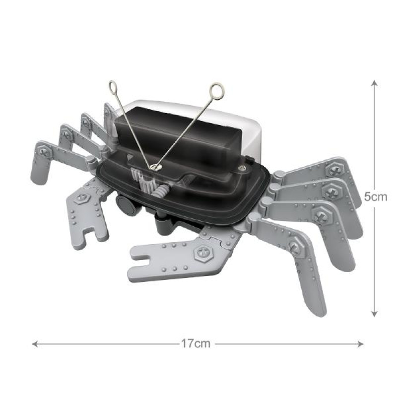 Хочете власноруч зібрати справжнє диво робототехніки? Настільний робот-краб із наукового набору від 4М вміє самостійно пересуватися, виявляти краї поверхні, якою повзає, і вчасно розвертатися. І як йому це вдається?Щоб дізнатися механіку роботи краба, вам доведеться уважно вивчити інструкцію та обережно зібрати всі складові робота. Зробити це можуть діти молодшого шкільного віку під наглядом дорослих. Для роботи вам знадобиться маленька хрестоподібна викрутка та батарейка AA, решту #8211; знайдете у коробці наукового набору.Робот-краб ніколи не впаде зі столу або іншій поверхні. Головне, не розташовувати його на самому краю столу або в кутку #8211; йому потрібне місце для маневру. Але якщо настільний робот все ж упав #8211; не переймайтеся. Конструкція ніжок краба амортизує удар та збереже його в цілості.Набір із серії KidzRobotix познайомить із пристроєм і роботою мотору, дасть базові знання в механіці, допоможе розвинути фантазію, логічне мислення та дрібну моторику. Також ви дізнаєтеся цікаві факти про справжніх крабів і високотехнологічних роботів. Наприклад, вгадайте, наскільки швидким може бути краб? Один із найспритніших крабів у світі розвиває швидкість до 16 км/год. Оце так! Зберіть свого настільного робота та насолоджуйтеся його акробатичними номерами.У наборі:Прозора кришка #8211; 1 шт.Шасі з мотором #8211; 1 шт.Ніжка #8211; 8 шт.Клешня #8211; 2 шт.Відсік для батареї #8211; 1 шт.Гвинт з шайбою #8211; 1 шт.Гвинт #8211; 3 шт.Металева антена #8211; 1 шт.Клемна кришка #8211; 2 шт.Вісь #8211; 2 шт.Шестерня #8211; 2 шт.Інструкція #8211; 1 шт.