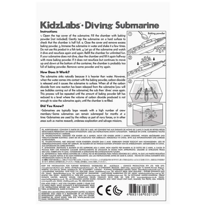 Із набором для досліджень від 4M можна проводити експерименти і спостерігати, як макет підводного човна занурюється і спливає за допомогою порошку для випічки. На звороті упаковки є опис досліджень із зображеннями, а також пояснення принципу дії. Занурення 1. Відкрийте верхню кришку підводного човна. Заповніть камеру порошком для випічки (немає в комплекті). Поставте підводний човен на тверду рівну поверхню, щоб перевірити, що камера наполовину заповнена. 2. Закрийте кришку і видаліть зайвий порошок для випічки із зовнішнього боку підводного човна. 3. Занурте підводний човен у воду і кілька разів потрусіть його. 4. Відпустіть підводний човен і спостерігайте, як він занурюється і з'являється над поверхнею води. Якщо човен не зануриться, додайте розпушувача. Якщо підводний човен не спливає, але продовжує рухатися вгору і вниз, камера, ймовірно, занадто заповнена порошком для випічки. Видаліть частину порошку і спробуйте ще раз. Як це працює? Підводний човен опускається, тому що він важчий за воду. Однак, коли вода контактує з порошком для випічки, виділяється двоокис вуглецю, і вивільнення газу викликає спливання. Коли весь вуглекислий газ буде випущений із підводного човна (ви побачите бульбашки), підводний човен знову зануриться. Цей процес буде повторюватися, доки кількість розпушувача, що залишилася в камері, не зменшиться до такого рівня, що обсяг виробленого діоксиду вуглецю стане недостатній для спливання підводного човна. Експеримент можна повторювати і показувати друзям.Набір для досліджень серії Science підійде хлопчикам від 5 років. Чудовий спосіб знайомства з основами хімії та фізики. Розвиток: мислення, уява, допитливість, винахідливість.