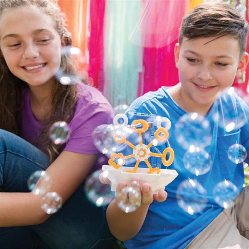 Науковий набір 4M Робот-мильні бульбашки дозволяє зібрати незвичайного робота, який самостійно видуває мильні бульбашки. У веселій грі діти від 8 років познайомляться з робототехнікою і фізикою.Зберіть робота по детальній інструкції з малюнками. Запустіть і спостерігайте, як він вправно видуває бульбашки з мильної води! У наборі є баночка для мильного розчину. Рідину для бульбашок можна легко зробити самостійно за рецептами в інструкції.Науковий набір допомагає дітям навчитися збирати механізми по інструкції. Розвиває мислення, інтелект, винахідливість, уважність, навички конструювання. Збирання працюючих моделей викликає інтерес до вивчення наук. Діти проводять час без гаджетів і на практиці бачать результат своїх старань. Набір із серії KidzRobotix підходить для занять удома і на курсах за освітньою методикою STEAM.Як влаштований робот? Батарея живить двигун, змушуючи його обертати вентилятор на високій швидкості. Вентилятор всмоктує повітря через верхню частину корпусу робота і видуває його через отвір у передній частині корпусу. Двигун також обертає набір зубчастих коліс, який крутить ротор із прикріпленими до нього паличками. Шестерні змінюють високу швидкість двигуна на повільну швидкість ротора. Палички занурюються в розчин, коли ротор обертається, покриваючи фігурні отвори тонкою плівкою мильної суміші. Коли палички рухаються перед вентилятором, повітря перетворює мильну плівку на бульбашки.Як виходять бульбашки? Товщина мильної плівки становить менше однієї тисячної міліметра. Вона еластична, як повітряна куля, тому вибухає. Плівка утримується силою поверхневого натягу, створюваної крихітними частинками в суміші, що чіпляються один за одного. Бульбашки круглі, тому що оболонка бульбашки завжди намагається стиснутися до мінімально можливої площі. Бульбашка лопається, тому що вода в ній повільно випаровується в повітря. Кольори веселки, що ви бачите на бульбашці, створюються світлом, що відбивається від її внутрішньої і зовнішньої поверхні.Комплектація: передня частина корпусу, задня частина корпусу, жолоб, 2 ока, вісь ротора, кришка батарейного відсіку, вентилятор, двигун, 2 кришки клем, 7 гвинтів, баночка для мильного розчину, 7 паличок із фігурними отворами.Додатково потрібні (немає в комплекті): невелика хрестова викрутка, батарейки 2 х ААА.