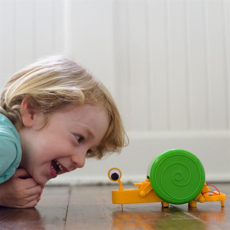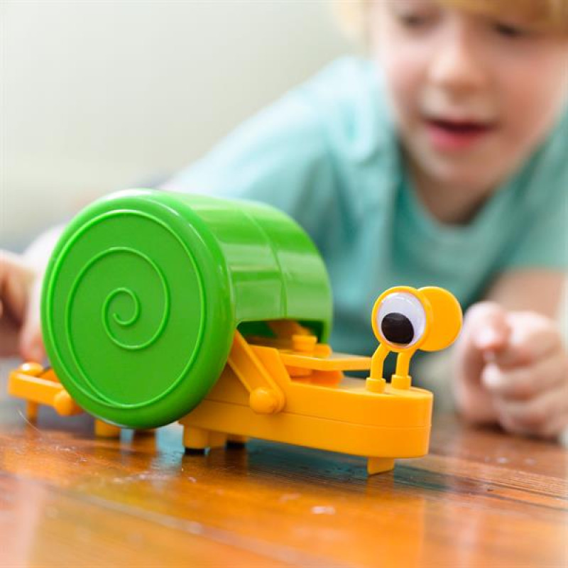 Робот-равлик своїми руками від 4M #8211; це захопливий спосіб дізнатися про механіку! Створіть самостійно роботизованого равлика і спостерігайте, як він ковзає по будь-якій поверхні. Науковий набір буде цікавий дітям від 8 років.Деталі в комплектіЧастина A: з'єднувач передньої петлі, B: тримач шарніра шестерні, C: тримач батарейного відсіку, D: з'єднувач задньої петлі, E: передня основа корпусу, F: передній шарнір x 2, G: лівий задній шарнір, H: правий задній шарнір, I: короткий штифт x 8, J: довгий штифт, K: середній штифт, L: рухливий шарнір, M: ліве око, N: праве око, O: задня частина корпусу, P: передня верхня частина корпусу, Q: мотор, R: корпус x 2, S: акумуляторний відсік, T: кришка акумуляторного відсіку, U: зубчаста вісь, V: мала шестерня, W: очі x 2, X: опора для пінопласту x 4, Y: маленький гвинт x 5.Додатково потрібні: невелика хрестова викрутка, 2 батарейки AAA.Зберіть робота за детальною інструкцією зі схемами. Усього 14 кроків і робот-равлик готовий! В інструкції є пояснення принципу дії механічного молюска і розділ з рішеннями можливих неполадок.Як працює розумний равлик?Сконструйований вами редуктор і шарнірний механізм оживають, перетворюючи електричний струм на кінетичну енергію. У цьому випадку струм виходить від батарей, в яких завжди є позитивний і негативний полюс. На позитивному полюсі дуже мало електронів, в той час як на негативному полюсі багато електронів. Якщо позитивний і негативний полюси з'єднані включенням перемикача, електрони рухаються, щоб виправити дисбаланс, створюючи електричний струм. Шарнірне з'єднання у верхній частині равлика використовує цю енергію для «повзання», як справжній равлик.Науковий набір порадує юних любителів науки і познайомить дітей з основними принципами механіки #8211; розділу фізики. Вивчати шкільні предмети тепер веселіше з класними роботами-іграшками від 4M, які можна сконструювати власноручно!
