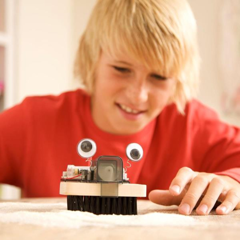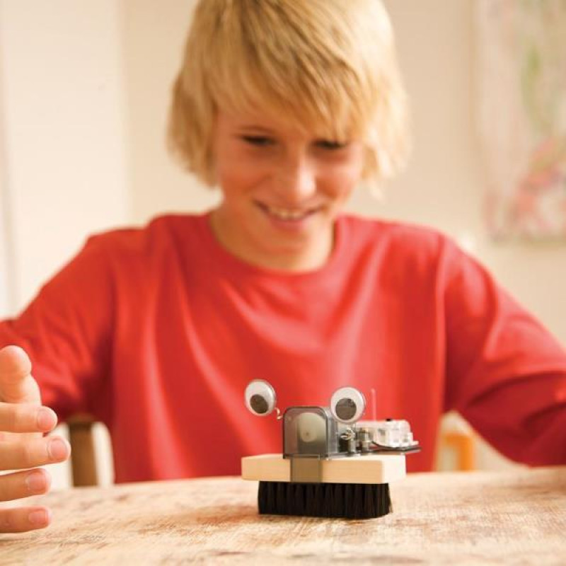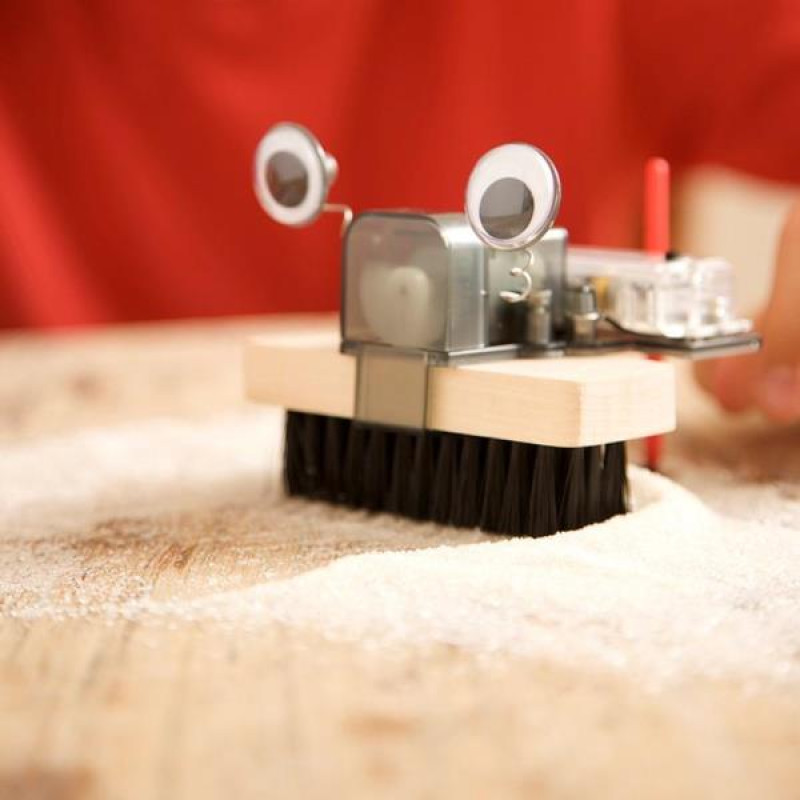Наукові набори з серії KidzRobotix допоможуть дітям створити цілу колекцію цікавих друзів-роботів. Познайомтеся з одним із персонажів цієї серії! Робот-щітка з милими круглими очима та щіткою, що нагадує вуса, рухається за рахунок вібрації.Батарейки забезпечують двигун енергією, змушуючи ротор обертатися на великій швидкості. Центр ваги ротора зміщений убік. Коли двигун вмикається, робот починає вібрувати, рухаючись вгору і вниз, з одного боку в інший. Щітка гасить вібрації та злегка пружинить під ним. Таким чином робот починає своє веселе пересування. Напрямок руху йому задає маленький пензлик. Змінюйте кут його нахилу, щоб робот рухався інакше.Матеріал щітки містить як синтетичні волокна, так і шерсть коней та свиней. Він чудово підійде для малювання. Створіть свою картину в дусі авангарду. Розстеліть великий аркуш паперу на підлозі, насипте на нього кольорову крейду або налийте трохи акрилової фарби, поставивши перед ним робота. Змінюйте кольори і напрямок руху іграшки, щоб створити унікальний малюнок.У веселій та ігровій формі дитина познайомиться з основами робототехніки, навчиться конструювати, зацікавиться наукою, стане допитливішою. Науковий набір від 4М буде цікавий дітям молодшого шкільного віку від 8 років.У наборі:Кришка для мотора #8211; 1 шт.Основа #8211; 1 шт.Тримач для маленької щітки #8211; 1шт.Кріплення для великої щітки #8211; 1 шт.Батарейний корпус із кришкою #8211; 1 шт.Клейка вкладка #8211; 1 шт.Набір болтів і гайок #8211; 1 шт.Гвинт #8211; 9 шт.Ковпачок-зажим #8211; 2 шт.Двигун із ротором #8211; 1 шт.Око з рухомою зіницею #8211; 2 шт.Дріт для кріплення очей #8211; 2 шт.Велика щітка #8211; 1 шт.Маленька щітка #8211; 1 шт.Інструкція #8211; 1 шт.