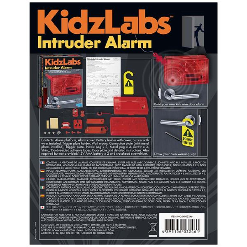 Тепер ніхто не зможе пробратися до вашої кімнати непоміченим! Зберіть власну сигналізацію з набором для досліджень від 4М. Забезпечте високий рівень безпеки у своєму таємному сховищі.Щоб зібрати і встановити сигналізацію, вам потрібні дозвіл і допомога дорослих. Усі деталі пристрою ви знайдете в наборі. Також візьміть маленьку хрестоподібну викрутку і дві батарейки AAA. Чітко дотримуйтесь інструкцій, вивчаючи базові принципи роботи електрики.Принцип роботи систем сигналізації від 4М дуже простий. Електричний ланцюг має дві точки, що керують подання струму на зумер: перемикач, вбудований у корпус батареї, і пластикова спускова пластина, вставлена між з’єднувальними пластинами. Між одвірком і пристроєм натягнуто струну. Коли двері відкриваються, струна тягнеться і висмикує пластикову пластину. З’єднувальні металеві пластини вступають у контакт одна з одною і запускають ланцюгом струм. У цей момент лунає виття сигналізації. Шпигуна помітили!Цей комплект знайомить дитину з основами фізики та електричних ланцюгів у цікавій ігровій формі. Додатковим бонусом стане табличка з проханням «Не турбувати!», яку можна повісити на двері під час проведення таємних операцій.Серія KidzLabs розвиває винахідливість, дрібну моторику, інтелект, логічне мислення, фантазію, надихає дітей на нові ігри та активність. Набір буде особливо цікавий хлопчикам молодшого шкільного віку від 8 років.У наборі:Коробка для сигналізації #8211; 1 шт.Кришка для сигналізації #8211; 1 шт.Відсік для батарейок із кришкою #8211; 1 шт.Зумер із дротами #8211; 1 шт.Тримач для спускової пластини #8211; 1 шт.Спускова пластина #8211; 1 шт.Настінне кріплення #8211; 1 шт.З’єднувальна пластина (зі встановленими металевими пластинами) #8211; 1 шт.Пластиковий кілочок #8211; 3 шт.Металевий стрижень #8211; 3 шт.Гвинт #8211; 3 шт.Струна #8211; 1 шт.Двостороння клейка стрічка #8211; 1 шт.Дверна табличка #8211; 1 шт.Інструкція #8211; 1 шт.