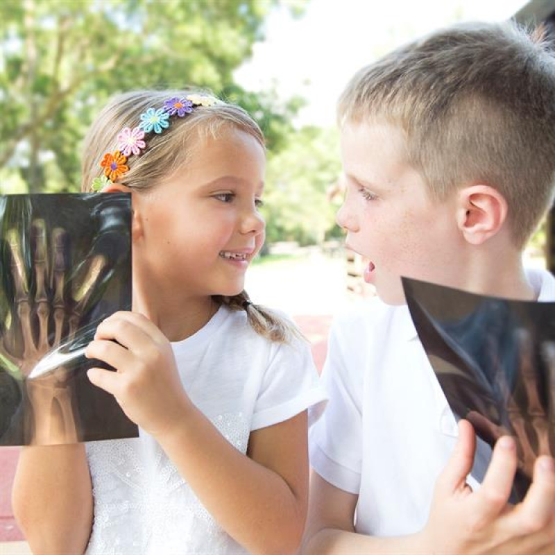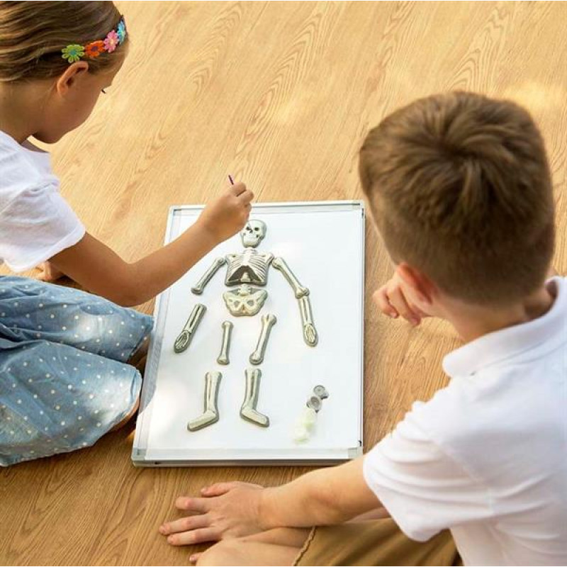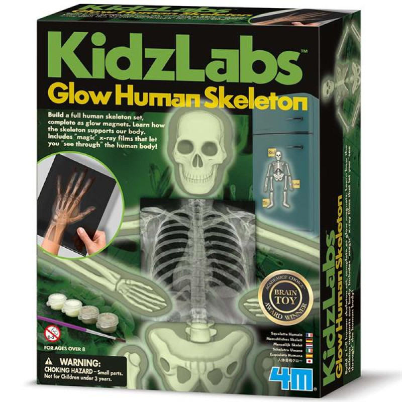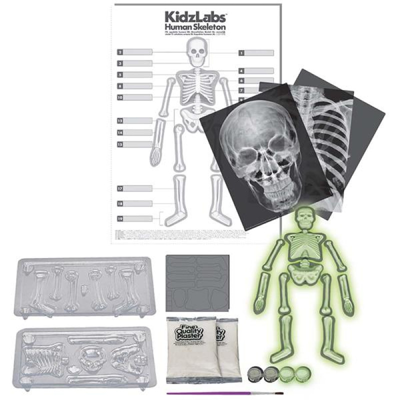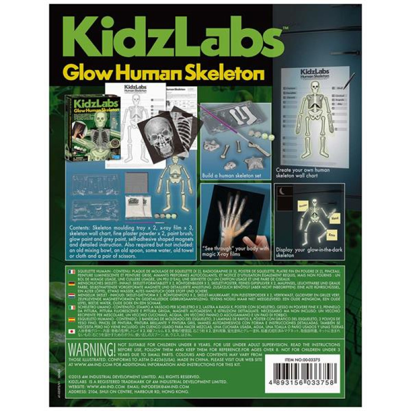 Створіть макет сяючого скелета людини на магнітах із набором для досліджень від 4М! Ви вивчите і запам'ятаєте назви кісток, дізнаєтеся основи анатомії та весело проведете час, спостерігаючи як скелет світиться в темряві. Крім того, в наборі ви знайдете цікаві рентгенівські знімки, які дозволять побачити справжній людський скелет!На вас чекає цікавий процес. Підготуйте посуд для змішування, пластикову ложку, трохи води, рушник і ножиці. Дотримуйтеся інструкції і вилийте гіпсовий розчин у форму. Кістки скелета застигнуть приблизно за півгодини, потім обережно викладіть їх на рушник і залиште для затвердіння на день. Далі розфарбуйте сірою та сяючою фарбами і прикріпіть на звороті магнітні наклейки. Розмістіть деталі скелета за схемою, підпишіть назви всіх кісток.Щоб побачити, як світиться скелет, потримайте його кілька хвилин під лампою, а потім вимкніть світло. Не забудьте про рентгенівські знімки, які ви знайдете в наборі для досліджень. Прикладайте їх до відповідних частин тіла і спостерігайте, як виглядають кістки.Скелет зсередини підтримує наше тіло, органи, зберігає і вивільняє мінеральні речовини за потреби. У маленької дитини скелет складається приблизно з 300 кісток. Коли людина виростає, деякі кістки зростаються, і їх кількість зменшується до 206.Цей набір із серії KidzLabs буде цікавий дітям молодшого шкільного віку від 8 років. Розфарбовування і збирання скелета підвищує рівень інтелекту, розширює кругозір, знайомить із наукою остеологією.У наборіФорми для лиття #8211; 2 шт.Рентгенівські знімки #8211; 3 шт.Настінна схема скелета #8211; 1 шт.Пакетики з гіпсовим порошком #8211; 2 шт.Набір сірої та сяючої фарб #8211; 1 шт.Набір магнітних наклейок #8211; 1 шт.Пензлик #8211; 1 шт.Інструкція #8211; 1 шт.
