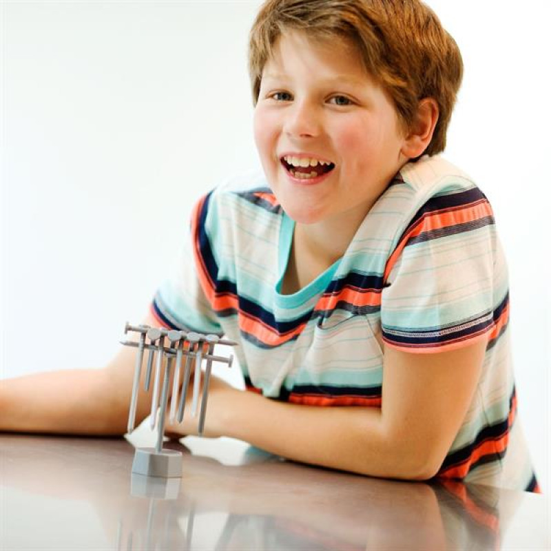 Набір для досліджень 4M Чарівні цвяхи дозволить здивувати друзів прийомом проти гравітації. Набір юного фокусника для дітей від 5 років дає можливість провести трюк із цвяхами, який можна науково пояснити.Ви зможете врівноважити 10 цвяхів на вершині одного без клею і магнітів. Як це зробити? Поставте основу на стіл перед глядачами і вставте один цвях в отвір в основі. Візьміть другий цвях і покладіть його на стіл. Потім візьміть ще один цвях і покладіть його на попередній під прямим кутом, як показано на малюнку. Покладіть ще один цвях так само, але вістрям в інший бік. Продовжуйте додавати цвяхи, чергуючи їх напрямки, доки у вас не залишиться один цвях. Покладіть його зверху в напрямку, протилежному нижньому. Стисніть всю конструкцію пальцями, акуратно підніміть її за кінці та поставте серединою на капелюшок цвяха, що стоїть на основі. Конструкція буде зберігати рівновагу. Оплески!Як працює цей фокус? У будь-якого об'єкта є точка, яка називається центром ваги. У цвяха вона посередині. Об'єкт зберігає рівновагу (не перевертається), якщо його центр ваги розташований над точкою опори. Конструкцію з цвяхів можна вважати єдиним об'єктом. Оскільки бічні цвяхи нахилені, центр ваги конструкції насправді розташований нижче точки опори. Це робить всю конструкцію стабільною і врівноваженою.Зацікавити дітей наукою і відірвати від гаджетів у наш час завдання не просте. Набір серії Science знайомить із поняттям рівноваги за допомогою цікавого фізичного експерименту. Розвиває допитливість, уяву, мислення, кругозір, впевненість у здібностях, спритність. Дає позитивні емоції від гри і нові знання з фізики.
