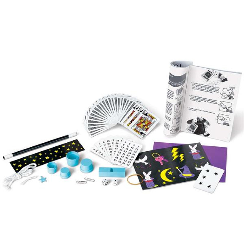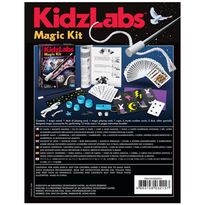 Влаштуйте магічне шоу з набором для досліджень від 4М! Ваші друзі будуть у захваті. Ви опануєте та продемонструєте 12 чарівних фокусів, покроково описаних в інструкції. Магія заснована на ілюзії: ви дізнаєтеся секрети магічних трюків і переконаєтеся, що вони не порушують закони фізики. Але нікому не розповідайте про це. Дозвольте глядачам милуватися чарами у вашому виконанні!У наборі від 4М із серії KidzLabs ви знайдете чарівну паличку, колоду гральних карт, скріпки, гральні кубики та інші речі з реквізиту мага. Додатково вам потрібен скотч.Щоб стати фокусником, необхідна практика. Проведіть репетицію виступу перед дзеркалом або запишіть на відео, щоб подивитися трюки очима глядачів. Для мага важлива акторська харизма. Спостерігайте виступи відомих фокусників: жести і слова важливі на шоу. Також оформіть кімнату відповідним чином: вимкніть світло, підготуйте столик з усім необхідним. Зробіть із картону капелюх-циліндр і накидку із зірками. Головне, розважайтеся від душі!Цей набір буде цікавий дітям від 8 років молодшої школи. Пізнання світу науки може проходити в захопливій формі, фокуси #8211; одна з них. Набір мага з реквізитом для трюків розвиває уважність, уяву, інтелект, координацію рухів, пам'ять, соціальні навички, емоційне благополуччя.У наборіКолода гральних карт #8211; 1 шт.Чарівна паличка #8211; 1 шт.Гральні кубики #8211; 2 шт.Скріпки #8211; 2 шт.Карти з цифрами #8211; 6 шт.Мотузка #8211; 1 шт.Набір кольорових картонних шаблонів #8211; 1 шт.Пластикові міні-циліндри #8211; 3 шт.Чарівна коробочка #8211; 1 шт.Інструкція #8211; 1 шт.