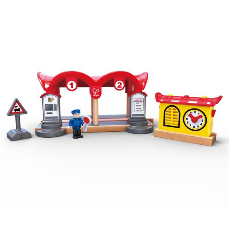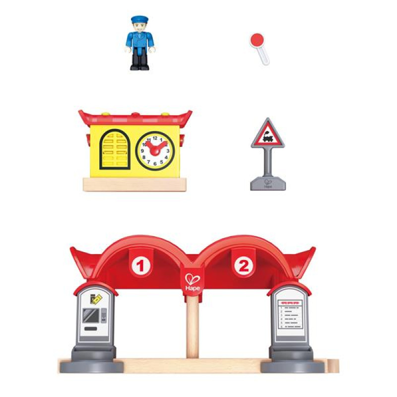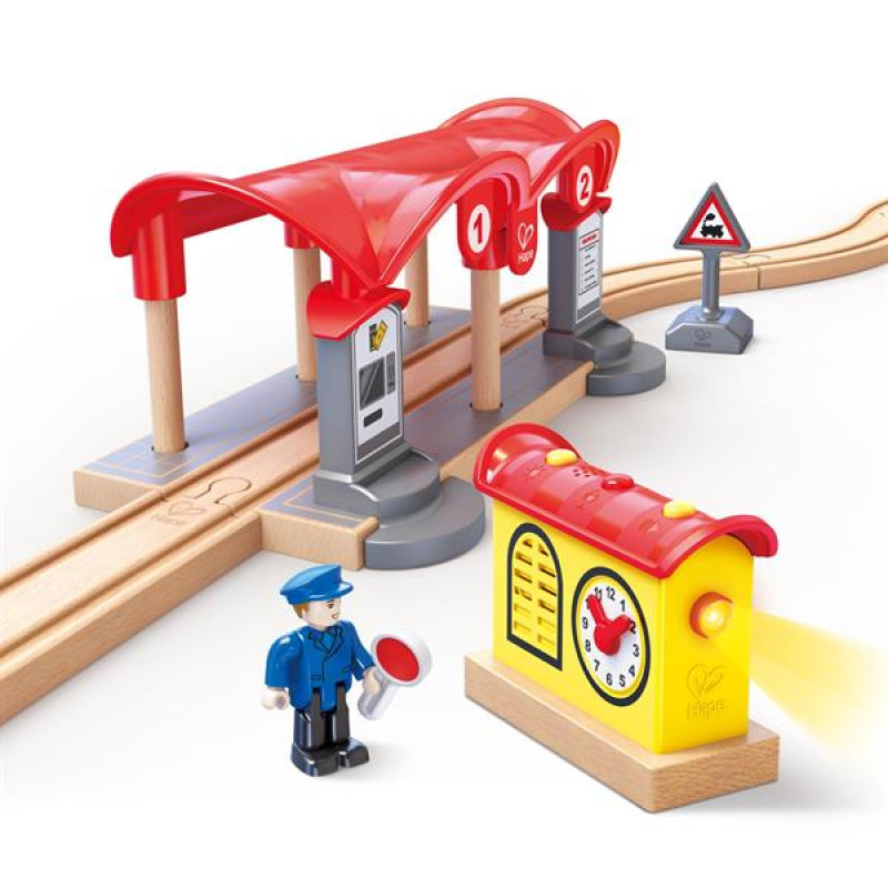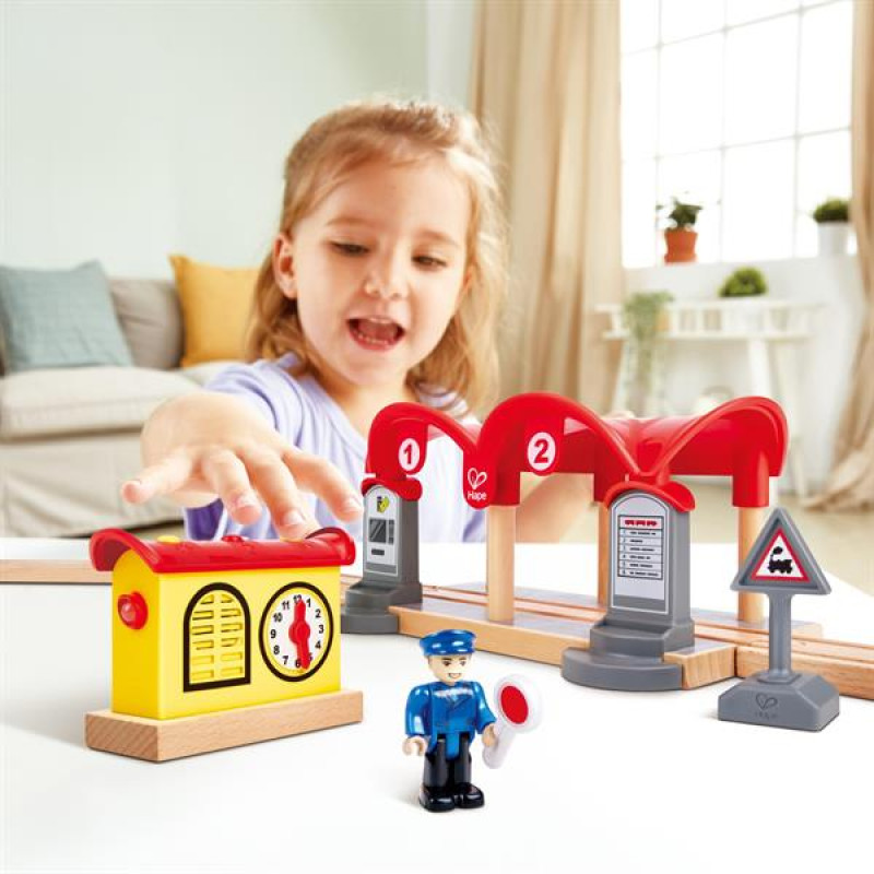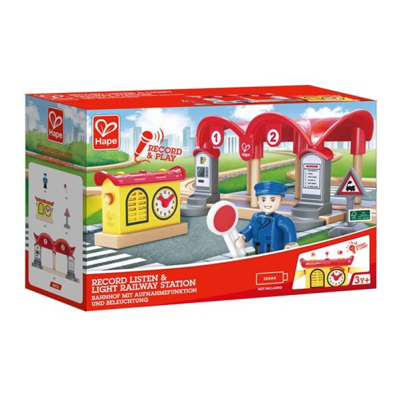Ігровий набір Hape Залізнична станція створений для доповнення залізниці Hape. Він також сумісний з усіма відомими брендами залізничних доріг.У комплекті є крита станція, автомат із продажу квитків, розклад поїздів і круглий годинник. Є функція запису повідомлення та підсвічування.Можна придумати та записати повідомлення про прибуття поїзда на станцію, а потім включати його разом із підсвічуванням. В автоматі персонажі гри купуватимуть квитки та звірятимуть час із розкладом поїздів.Ігровий набір Hape Залізнична станція розвиває уяву та творче мислення дітей під час рольових ігор.Усі деталі набору виконані якісно з безпечного дереву та пластику. Потрібні 2 батареї АА (немає в комплекті) для роботи звукових і світлових ефектів. Набір призначений для дітей віком від 3 років.
