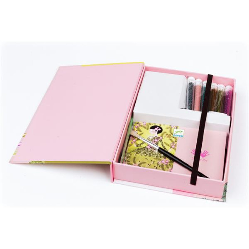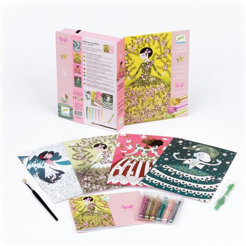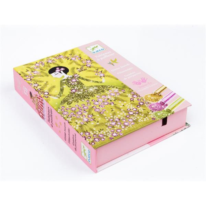 Художній набір Блискучі вбрання від французької компанії DJECO сподобається юним модницям, адже в ньому містяться вбрання найкращих модельєрів. А дизайнером може стати кожен!Для розфарбовування моделей не потрібні олівці, пензлі та фарби, замість них у комплекті є яскраві блискітки. Їх слід сипати на звільнену від захисного шару ділянку та розподіляти пензлем. Завдяки клею, що знаходиться поверх малюнка, частинки приклеюються, фарбуючи поверхню.Всі елементи зображення мають свій номер, якому відповідає цифра на тюбику з блискітками. Але не обов'язково дотримуватись інструкції при виборі кольору, можна створити свій маленький шедевр!