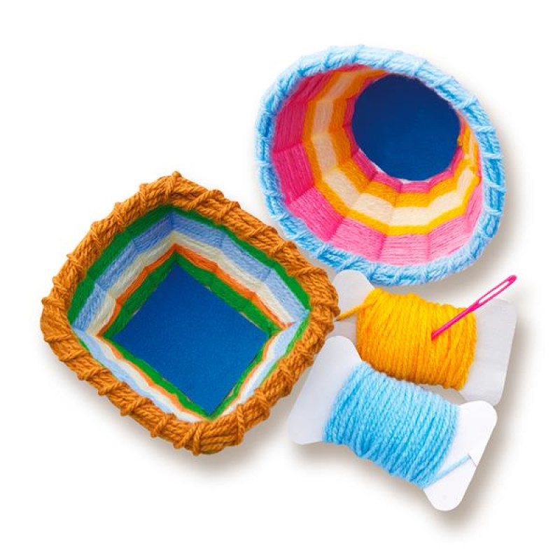 Набір для творчості 4M Кошики з пряжі містить все необхідне для виготовлення двох декоративних кошиків із пряжі. Набір серії KidzMaker підійде дітям від 5 років. Це чудовий подарунок для дівчинки, яка любить рукоділля. В інструкції з малюнками докладно описаний процес створення кошиків із різнобарвної пряжі. Він простий і зрозумілий для дитини. Усі матеріали безпечні. Заняття рукоділлям розвивають творчі здібності, естетичний смак, тренують навички дрібної моторики, зорово-моторної координації, тактильні відчуття і сприйняття кольорів. Дівчинка самостійно змайструє оригінальні практичні кошики для зберігання домашніх дрібниць. Речі ручної роботи також хороший подарунок для подруг або рідних. У комплекті: 2 шаблони кошиків, 1 пластикова голка, 2 тканинні клаптики, 7 котушок кольорової пряжі, 1 пакетик клею і докладна інструкція. Додатково потрібні 4 прищіпки-затискачі для паперів.