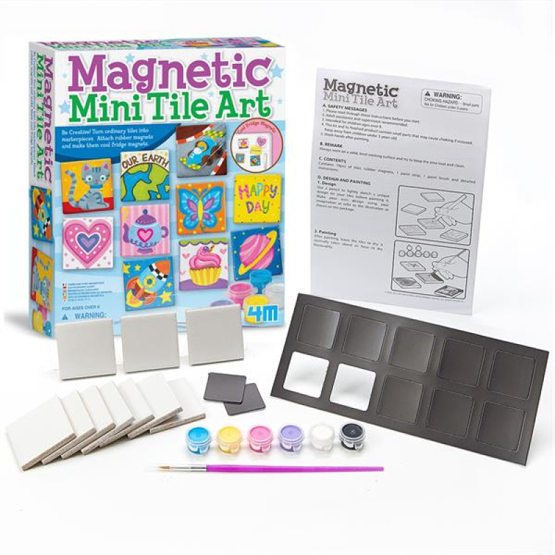 Створіть власноручно декоративні магніти, якими можна прикрасити холодильник або подарувати друзям! Набір для творчості від 4М містить усе необхідне, вам залишиться лише повністю зануритися у творчість.Проявіть свої здібності у домашній творчій майстерні. Для початку нанесіть на міні-плитки малюнок простим олівцем. Увімкніть уяву або скористайтеся готовими ідеями на упаковці, а потім прикрасьте свій шедевр! Змішуючи фарби, як зазначено в інструкції, ви отримаєте нові кольори і відтінки. Наприклад, щоб вийшов зелений #8211; змішайте жовтий і блакитний, для рожевого #8211; червоний із білим, для помаранчевого #8211; жовтий із червоним.Дайте фарбі просохнути протягом години і починайте перетворення ваших картинок на магніти. Для цього притисніть магніт клейким боком до обороту плитки. Хенд-мейд магніти готові радувати вас і друзів!Набір для творчості з серії Crafts підійде дітям від 8 років і може використовуватися за методикою навчання Реджио на розвиваючих заняттях. Розмальовування магнітів позитивно впливає на фантазію, колірне сприйняття, творчі здібності та дрібну моторику.У наборіМіні-плитки (4,5 см) #8211; 10 шт.Набір магнітів #8211; 1 шт.Набір фарб #8211; 1 шт.Пензлик #8211; 1 шт.Інструкція #8211; 1 шт.