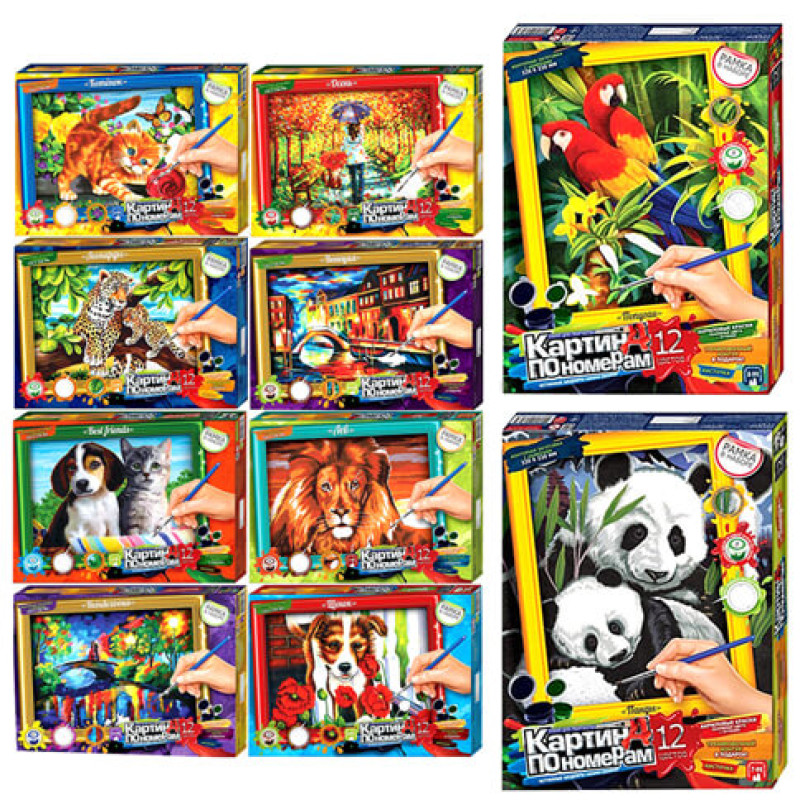 Набір для розпису на полотні Картина за номерами дитяча великий KN-01-01, 02, 03, ... 10 Малювати може кожен, а з картинами за номерами - це цікаво і захоплююче! У Вас вийде створити авторський шедевр своїми руками навіть якщо будете працювати з полотном і фарбами вперше. Захоплююча малювання за номерами сприятливо впливає на настрій, творчий розвиток і приємний результат - особистий шедевр на стіну в інтер'єр або як подарунок hand-made. Все просто! Необхідно придбати картину за номерами, отримати, розпакувати і відразу можна починати писати на полотні акриловими фарбами свій тематичний сюжет. Малювати потрібно по пронумерованим контурам, які відповідають кольору фарби (номер на кришечці контейнера), досить буде акуратно зафарбовувати контури і почне вимальовуватися справжня картина. Набір для творчості з красивим сюжетом на полотні і всім необхідним для створення готової картини: - Натуральний полотно на підрамнику з галерейного натяжкою. На картині нанесена схема контурів зображення з нумерацією - 2 нейлонові художні кисті - Соковита палітра, пронумерованих, акрилових фарб в контейнерах - Специфікація - Перелік пунктів. Набір для творчості «Картина за номерами» - це прекрасний подарунок, гарний сувенір і корисне придбання для творчого дозвілля, адже результат заняття таким хобі - користь для здоров'я (відпочинок), а інтер'єр обзаведеться красивим декором.