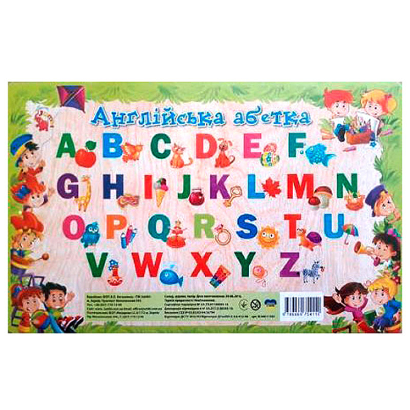 До набору входить: міні-плакат із літерами англійського алфавіту, малюнки тварин.