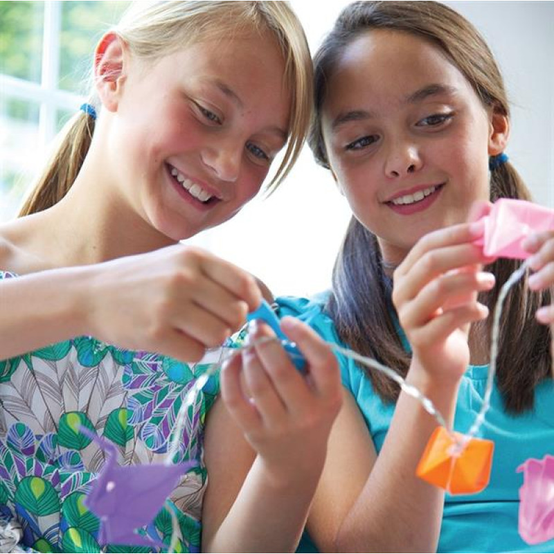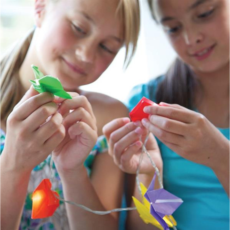 Прикрасьте кімнату красивою гірляндою ручної роботи з набором для творчості від 4М! У своїй творчій майстерні ви опануєте новий вид рукоділля #8211; орігамі. Мистецтво орігамі родом із Стародавнього Китаю, де також була винайдена технологія виготовлення паперу. Ви навчитеся складати 5 різних орігамі у формі тюльпана, метелика, сердечка, полуниці та журавля. Ваші шедеври прикрасять гірлянду з 10 світлодіодних лампочок.У наборі ви знайдете докладну інструкцію з ілюстраціями. Додатково вам потрібні ножиці. Для початку потренуйтеся складати орігамі зі звичайного паперу. Коли паперові фігурки стануть виходити акуратними, переходьте до різнобарвного паперу з набору. Прикріпіть до лампочок готові орігамі, попередньо обрізавши кінчик. Вставте по лампочці в кожну фігурку і закріпіть скотчем. Для роботи гірлянди додатково будуть потрібні дві батарейки АА.Цей набір із серії KidzMaker підійде дітям дошкільного віку від 5 років. Складаючи орігамі, вони проявлять уяву і творчі здібності, потренують дрібну моторику, підвищать креативність, навчаться поєднувати кольори і весело проведуть час.У наборіГірлянда з 10 світлодіодними лампочками #8211; 1 шт.Аркуші паперу для орігамі #8211; 10 шт.Клейка стрічка #8211; 1 шт.Інструкція #8211; 1 шт.