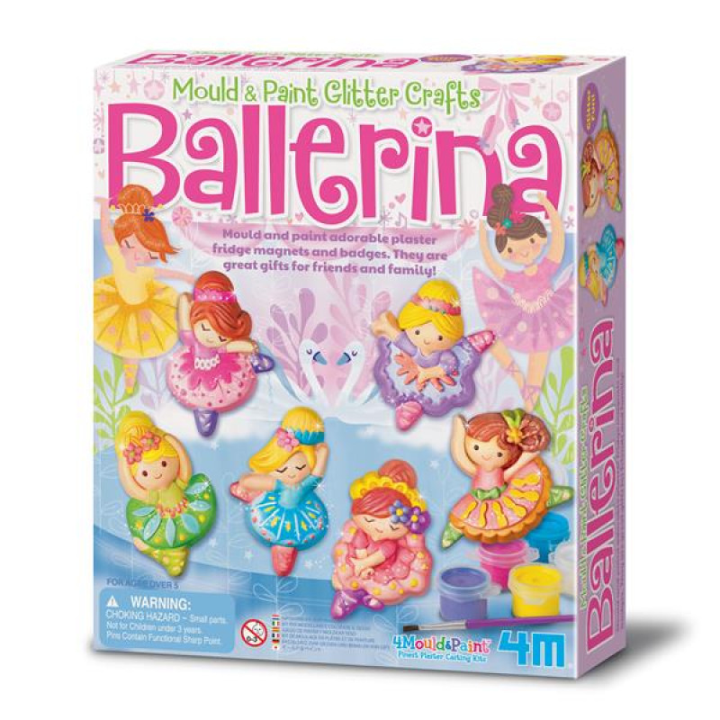 Зроби і розфарбуй #8211; тематика наборів для творчості від 4М, з якими за допомогою гіпсу, формочок і різнокольорових фарб виходять фігурки на магнітах і булавках. Створіть своїми руками шість танцюючих балерин в святкових сукнях із цим комплектом. Прикрасьте ними одяг або рюкзак, прикріпіть на холодильник або залізну настільну лампу. Фігурки у вигляді балерин стануть чудовим подарунком подружкам!Підготуйте для роботи чашу для змішування, трохи води і пластикову ложку. Готовий гіпсовий розчин залийте у формочки, дотримуючись інструкції. Для отримання брошок, покладіть на свіжу заготівку булавки. Дочекайтеся повного висихання фігурок і починайте розфарбовування. Сміливо змішуйте фарби, щоб отримати нові відтінки. Приклейте на інших балерин магніти.У цьому наборі для розвитку з серії Mould Paint ви також знайдете пакетик з блискітками. Використовуйте їх для декору святкових суконь балерин. Нехай вони виблискують під час танцю! Наносьте блискітки на фігурки, доки не висохла фарба.Набір для творчості від 4М буде цікавий дівчатам дошкільного віку від 5 років. Створюючи барвисті фігурки у вигляді балерин, діти проявлять творчі здібності, навчаться поєднувати кольори, розвинуть дрібну моторику і уяву.У наборіШаблон із 6 формами для лиття #8211; 1 шт.Пакетик із гіпсом #8211; 1 шт.Набір фарб #8211; 1 шт.Магнітна стрічка #8211; 1 шт.Булавки #8211; 2 шт.Пензлик #8211; 1 шт.Пакетик із блискітками #8211; 1 шт.Інструкція #8211; 1 шт.