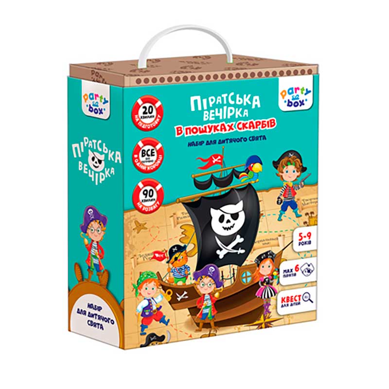 Набір для свята Піратська вечірка українська - це 90 хвилин захопливого квесту з пошуку скарбів.