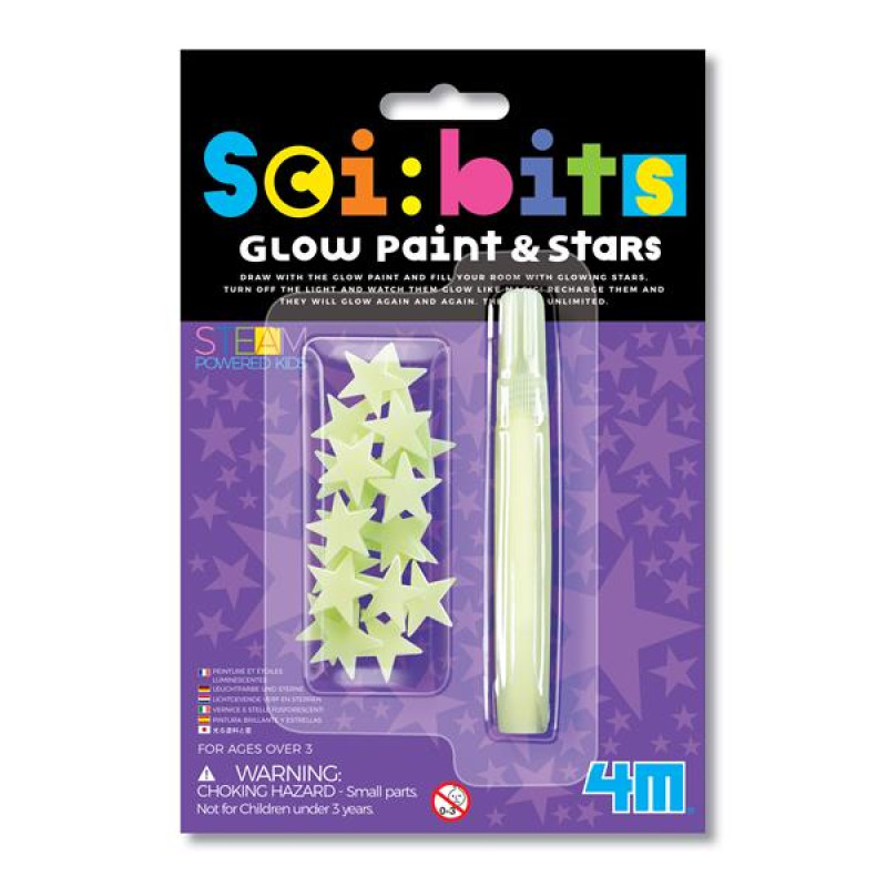 У наборі для творчості 4M Розмалюй зірки ви знайдете зірки, клейкі вкладиші та особливий фломастер. Якщо їм розмалювати зірки, то вони будуть світитися в темряві. Ігровий набір призначений для дітей від 3 років. Як наклеїти У комплекті є спеціальні двосторонні вкладиші для наклеювання зірок. Зніміть зі вкладиша спочатку одну захисну плівку і прикладіть до звороту зірки. Потім зніміть другу захисну плівку і наклейте зірку на тверду поверхню. Фломастер наповнений спеціальною речовиною, що містить частинки, які поглинають та акумулюють світло. Ви можете малювати ним на папері або розфарбувати зірочки. Достатньо увімкнути в кімнаті лампу на кілька хвилин, щоб милуватися чарівним сяйвом зірок у темряві. Ігровий набір наклейок буде цікавий дітям дошкільного віку. Дитячі наклейки покращують настрій і відкривають простір для фантазії, активують творчу уяву. У комплекті: - зірки, - двосторонні клейкі вкладиші, - фломастер з речовиною, що світиться в темряві.