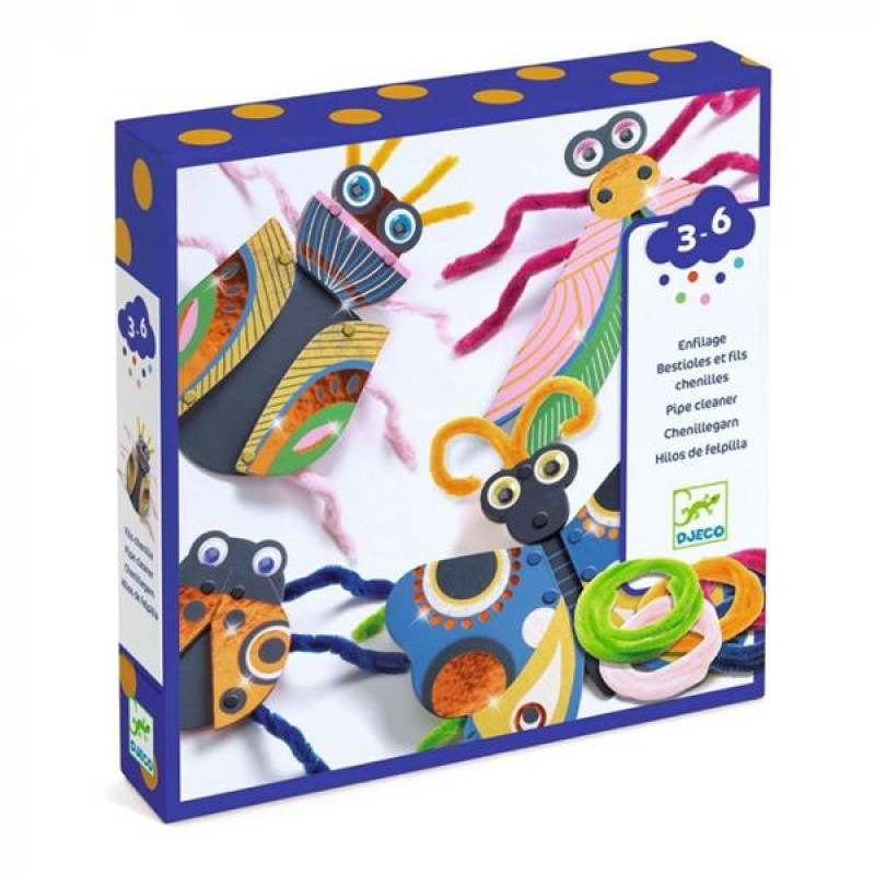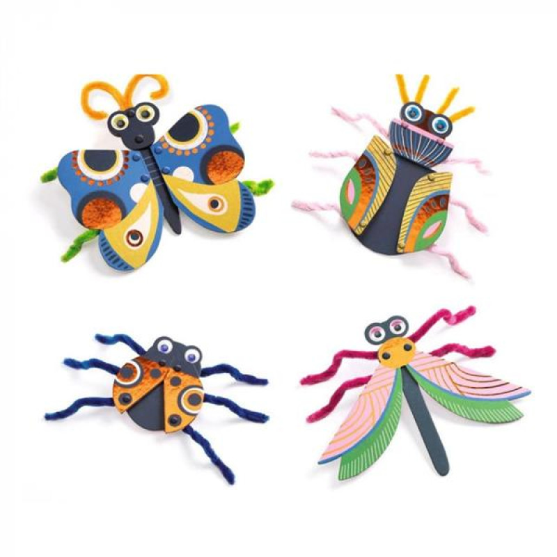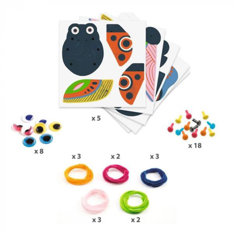 Набір для творчості DJECO Комахи розвиває творчі здібності, дрібну моторику та вчить терпінню.Щоб розпочати складання, потрібно виштовхнути елементи із заздалегідь вирізаних листів, а потім з'єднати їх за допомогою безпечних шпильок. Потім додаємо забавні рухливі очі і за допомогою синельного дроту робимо лапки та вусики.Комплектація:- 5 ілюстрованих дощок із щільного картону з елементами жуків;- різнокольоровий синій дріт;- 16 безпечних шпильок;- 8 рухливих очей;- покрокова інструкція у картинках.Комахи можна розібрати і зібрати знову, комбінуючи елементи та вигадуючи нових незвичайних істот.