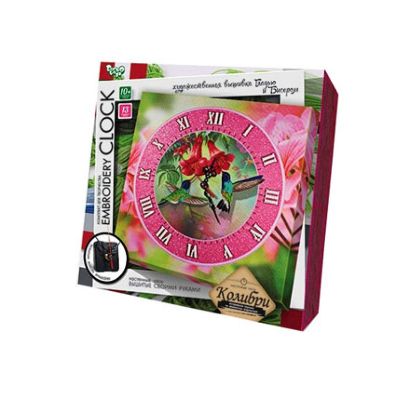 Набір для творчості Embroidery clock Колібрі - цей набір подарує Вам можливість зробити настінний годинник вишитий своїми руками. Вишивка гладдю та бісером. Після створення вишивки, встановлюємо деталі годинника: годинниковий механізм, стрілки. Готовий годинник вставимо в рамку 30х30 см і прикрасимо ним стіну.