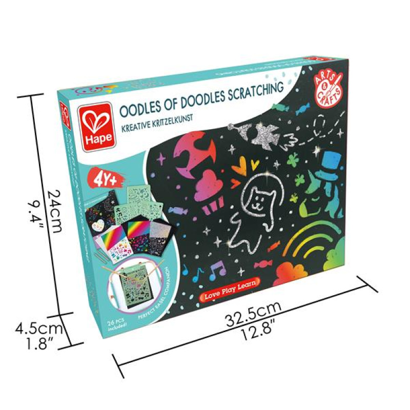 Набір для творчості Hape Дудлінг призначений для дітей віком від 4 років. У набір входять три тематичні трафарети, 20 листів для скретчингу з трьома типами кольорових шарів, два дерев'яні стилуси та лист-інструкція.Помістіть трафарети на один із 20 листів, що додаються, і акуратно зітріть силует дерев'яним стилусом, щоб відкрити під ним кольоровий шар або з блискітками. Поєднуйте трафарети, щоб створити чудовий малюнок.Набір ідеально підходить для маленьких художників, щоб дізнатися більше про дудлінг і мистецтво. Розвивайте творче мислення дитини та її дрібну моторику за допомогою гарного набору для скретч-арту.Усі продукти Hape виготовлені з високоякісних матеріалів і вкриті нетоксичними фарбами, безпечними для дітей. Це ідеальний подарунок для дітей віком від 4 років і більше. Кожен виріб зручно тримати в руці та використовувати.