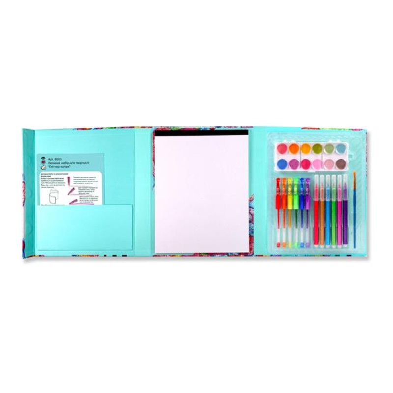 Набір для творчості I heart art Гліттер-колаж присвячений любителям сяйва та мерехтіння. Тут є все щоб створити блискучий шедевр!Посібник з методів усередині показує вам, як використовувати та комбінувати всі блискучі художні матеріали. Він навіть включає практичний проект, так що ви можете розмальовувати і малювати в посібнику, перш ніж створювати свої власні творчі роботи!Набір у твердій палітурці містить:- гід з техніки малювання українською мовою;- 12 перламутрових акварельних фарб;- 6 гелевих перламутрових ручок;- 6 фломастерів із блискітками;- пензлик;- 20 аркушів спеціального паперу.Всі блискучі художні речі акуратно зберігаються в міцному високоякісному палітурному пристрої, складеному втричі, з магнітною застібкою.