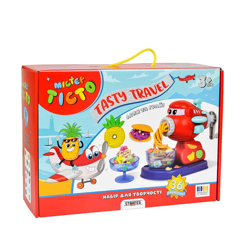 "Містер тісто. Tasty travel" - це набір для творчості, що перенесе малюків у захопливу кулінарну подорож. Діти зможуть створити різноманітні смаколики. А допоможе їм у цьому маленький літачок, що містить насадки для незвичних текстур. А яскравий пластилін та формочки зроблять цей процес легким та цікавим. Веселої кулінарної пригоди разом із "Містер тісто. Tasty travel" від ТМ Strateg.