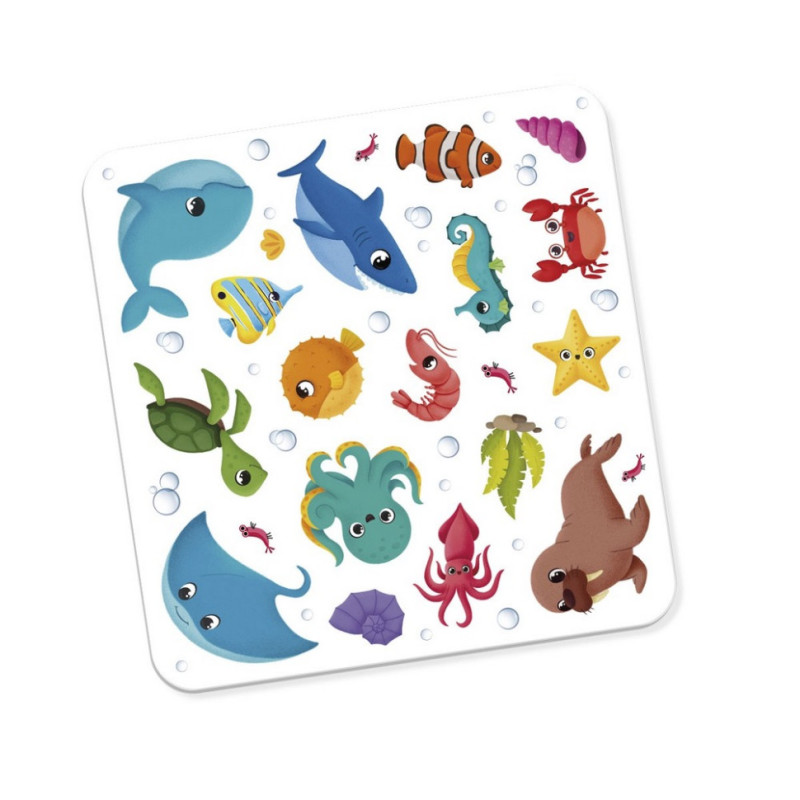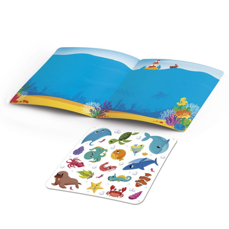 Набір для творчості містить велику кількість різноманітних наліпок із зображеннями морських мешканців на планшетці: різні види риб, кит з акулою, морська зірка, краб, водорості, мушлі та інше. Різноманітність наліпок у наборі сприяє створенню своєї унікальної підводної картини морського дна.