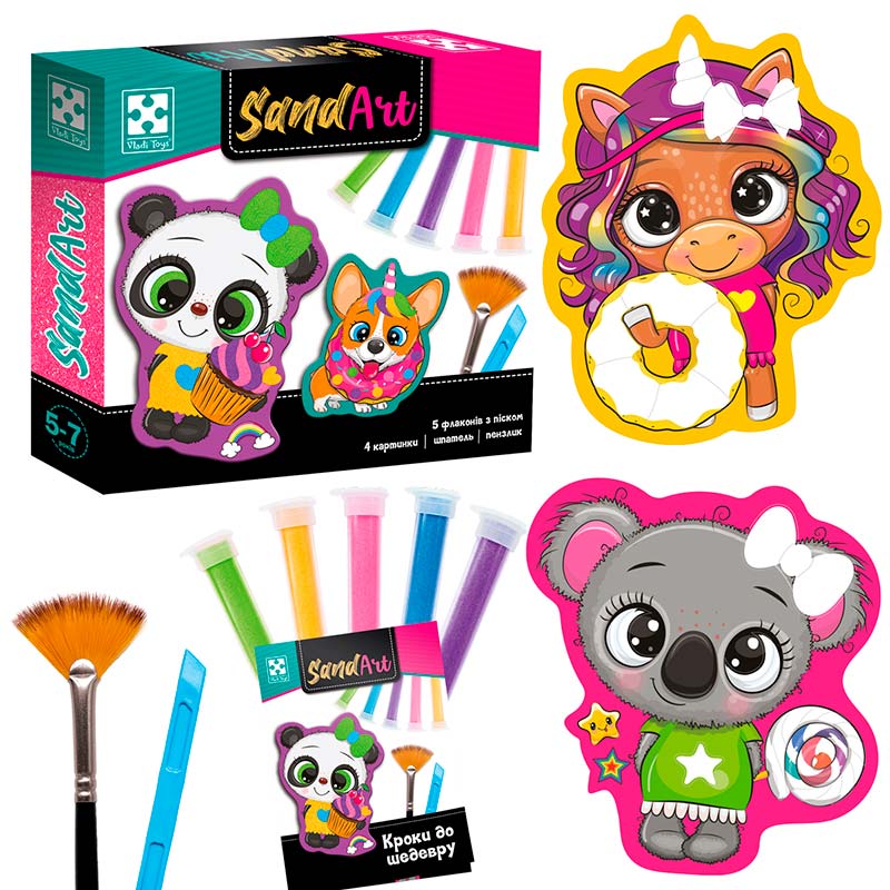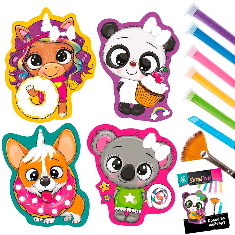 Комплектація: 5 флаконів з піском, 4 картинки, шпатель, пензлик, творчий посібник.