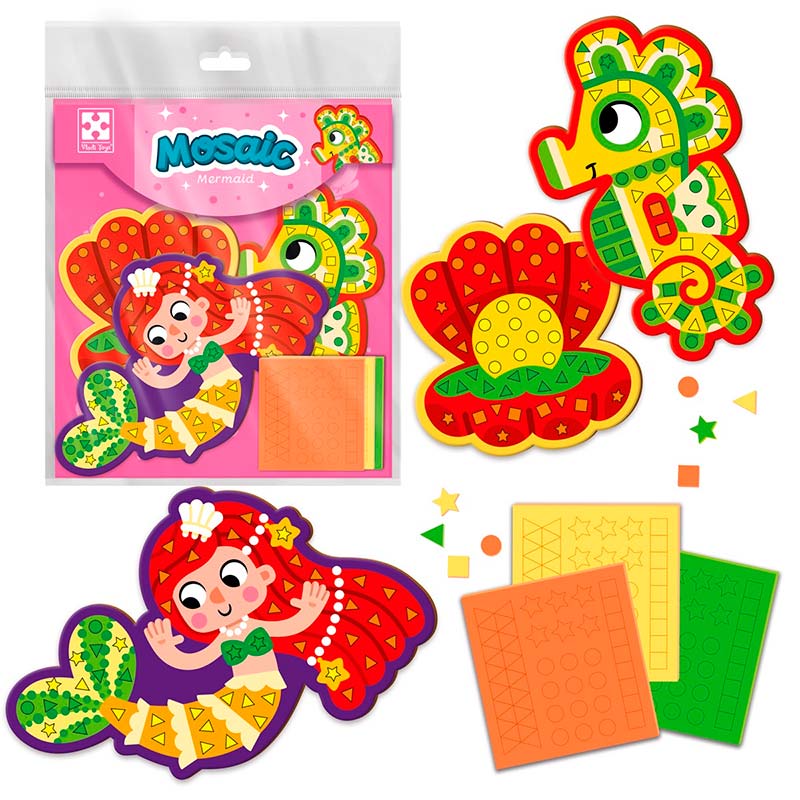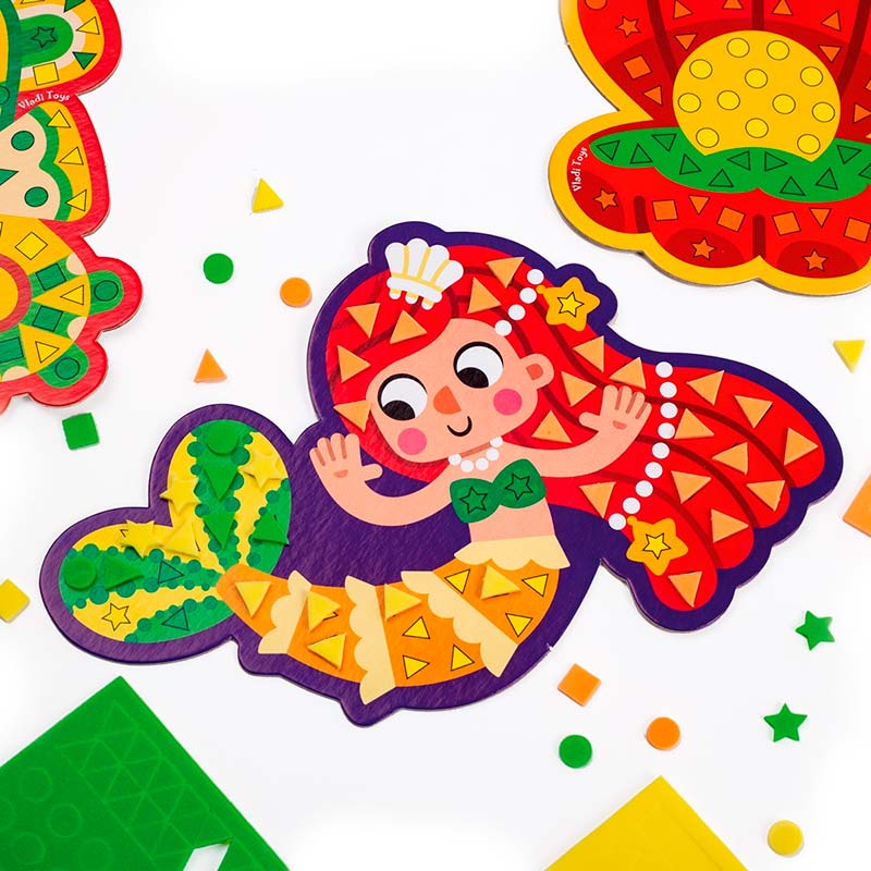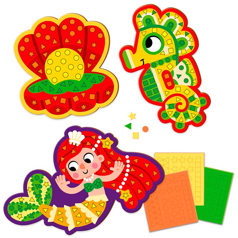 Розвивайте дрібну моторику малюка разом із русалонькою та морським коником. Прикрасьте їх м’якими елементами мозаїки, щоб створити унікальну картинку.