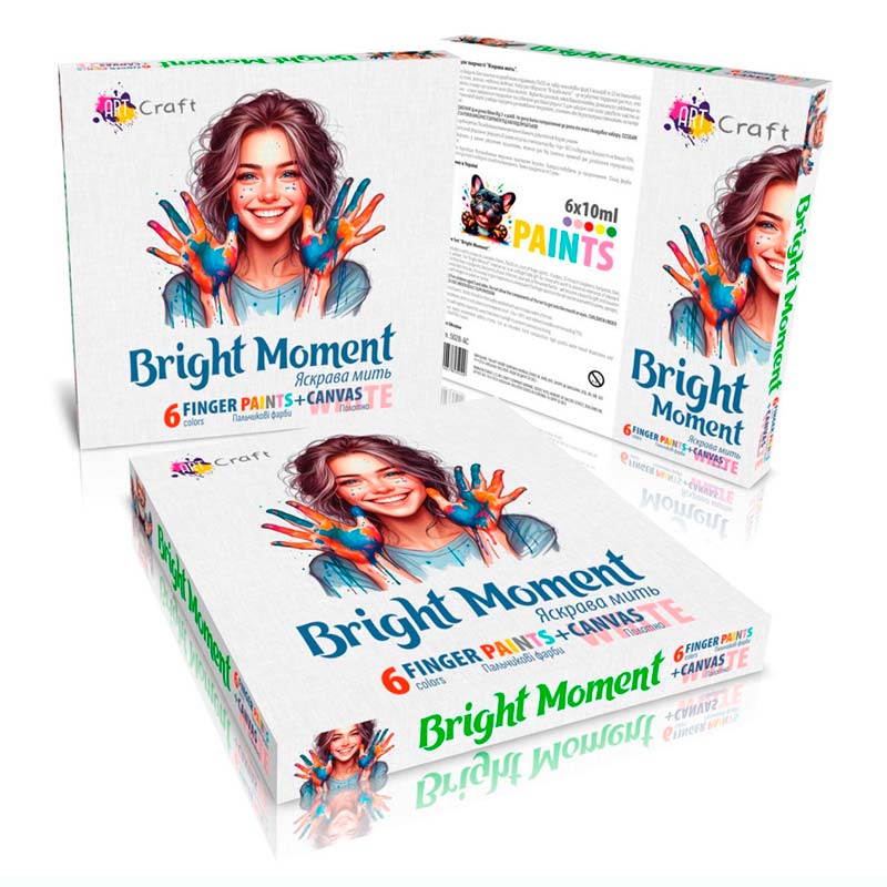 Набір для творчості «Яскрава мить». У набір входить біле полотно на дерев'яному підрамнику 25х30 см, набір пальчикових фарб 6 кольорів по 10 мл (малиновий, бірюзовий, синій, зелений, червоний, жовтий). Набір для творчості «Яскрава мить» - це незабутній подарунок для тих, хто хоче зберегти спогади про приємні миті свого життя. Відбитки долонь, ніжок Вашого малюка, домашнього улюбленця чи всієї родини – стане чудовим подарунком та сувеніром для Вашої родини! Із цим набором так легко дарувати щастя на згадку! Пальчикові фарби з набору підходять для малювання пензликами, спонжами або пальчиками безпосередньо на папері або полотні. ПОПЕРЕДЖЕННЯ! Для дітей віком від 3 років. Не допускати попадання в рот та очі складових набору. ОСОБАМ У ВІКУ ДО 14 РОКІВ ВИКОРИСТОВУВАТИ ПІД ПРИГЛЯДОМ БАТЬКІВ! Містить дрібні деталі. Після використання ретельно вимити руки теплою водою із милом. Особливості умов зберігання: зберігати у сухому місці при температурі від +5 до +30 С та відносній вологості не більше 75%. Фарби зберігати із щільно закритими кришечками, подалі від сонячних променів для запобігання передчасному висиханню. Продукція відповідає встановленим медичним критеріям безпеки. Використовувати за призначенням. Склад фарби: високоякісні дисперсії на водній основі та колоранти. Термін придатності 2 роки Зроблено в Україні