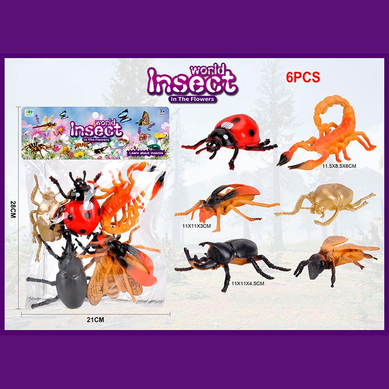 Містить шість мініатюрних фігурок, кожна з яких зображає окрему комаху. Комплект можна використовувати для сюжетно-рольових ігор, навчальних занять з природознавства та колекціонування; з його допомогою демонструють різноманіття комах, сортують за типами й створюють тематичні композиції. Підходить для вправ на розвиток уяви й дрібної моторики під наглядом дорослих.